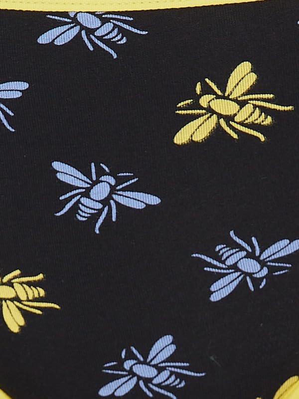 Black mid waist hipster panty offering medium coverage.Crafted with breathable stretchable cotton spandex fabric.Designed with dragonfly print all over.Soft yellow elastic at the waistband leg openings for a snug fit.Double layered gusset for hygiene.