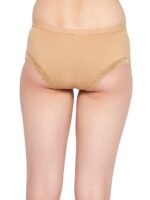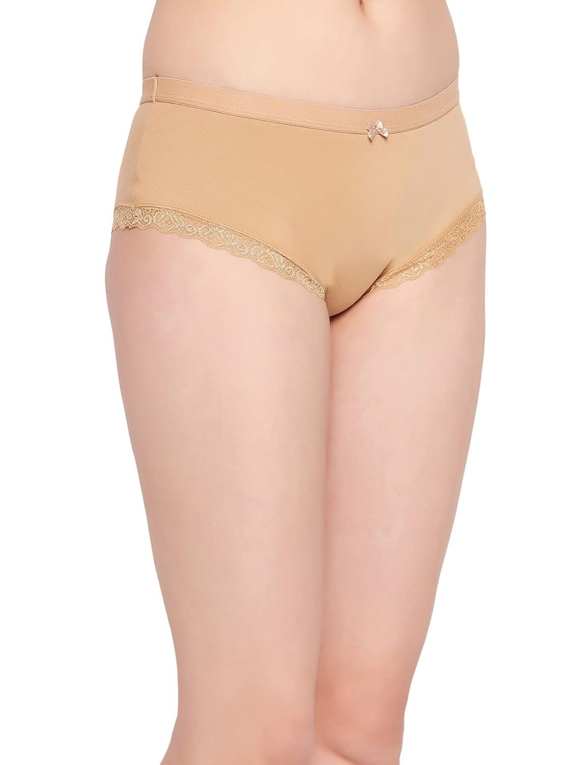 Nude colour mid waist hipster panty offering medium rear coverage.Crafted with breathable stretchable cotton spandex fabric.Designed with lace trims on the leg openings.Cute bow at the centre for embellishment.Soft elastic at the waistband leg openings for a snug fit.Double layered gusset for hygiene.