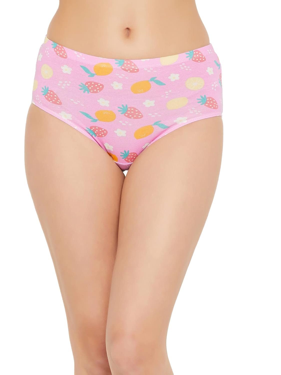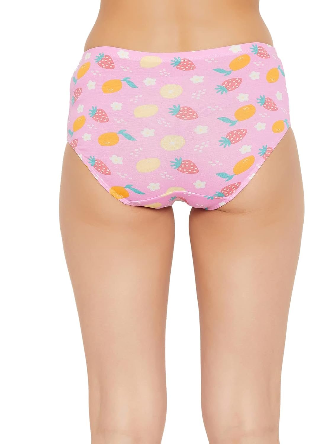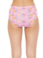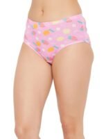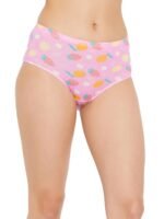 Baby pink mid waist hipster panty offering medium coverage.Crafted with soft stretchable cotton spandex fabric.Designed with fruit flower print all over.Soft elastic at the waistband leg openings for a snug fit.Double layered gusset for hygiene.Inner ElasticElastic along at the waistband leg openings are encased in fabric for a comfortable snug fit.