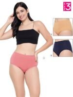 Pack of 3 High waist hipster panty. Crafted with the comfort of cotton. Offers medium rear coverage. Features soft outer elastic on waistband & leg openings. Has double layered gusset.