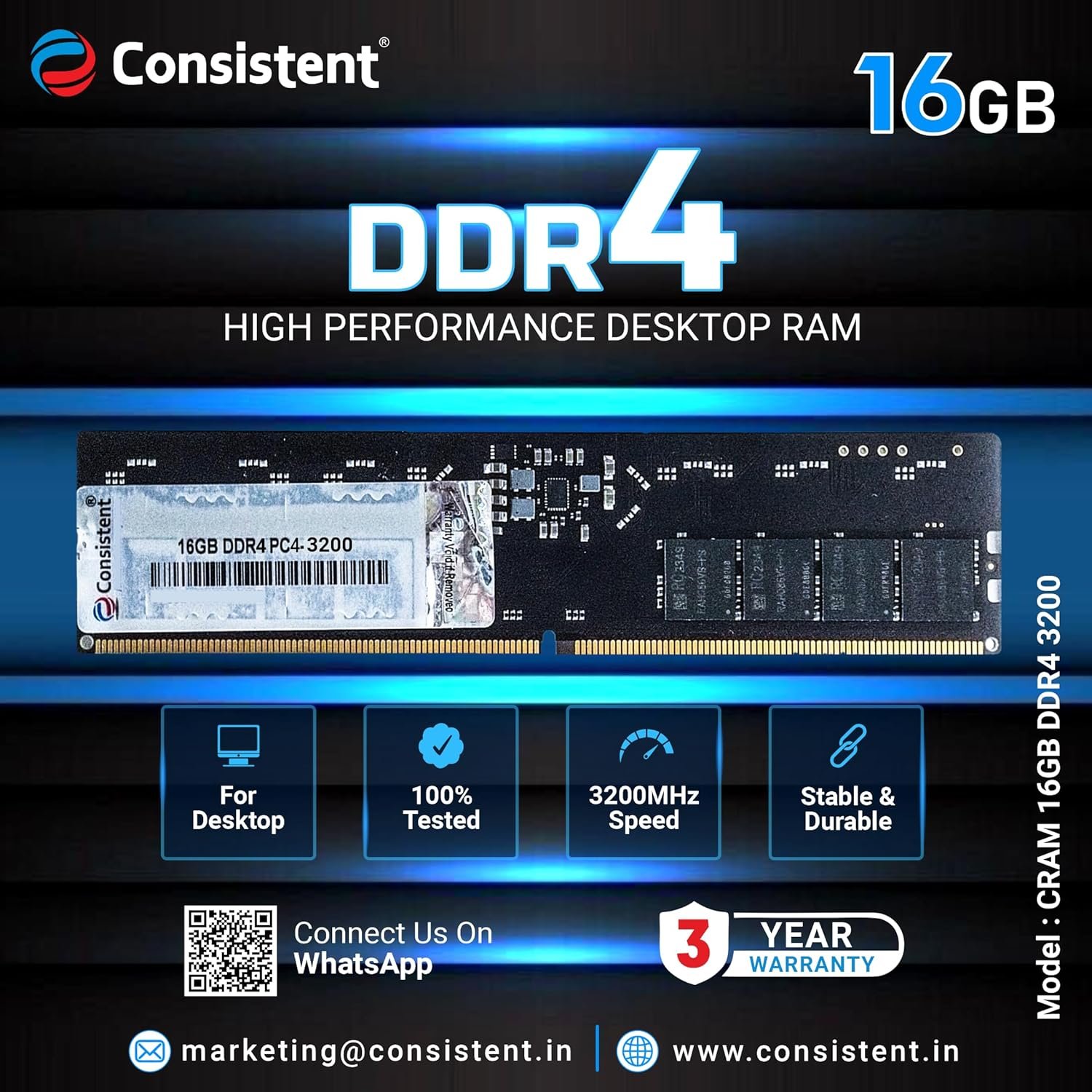 Consistent 16GB DDR4 RAM 3200Mhz Desktop RAM, Plug-and-Play, No Additional Drivers Required with 3 Year Warranty