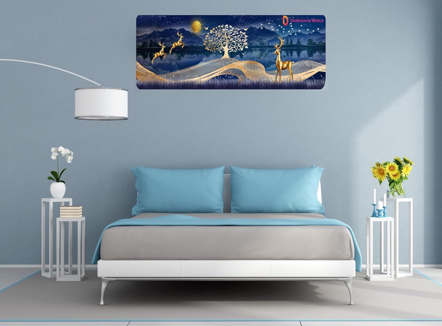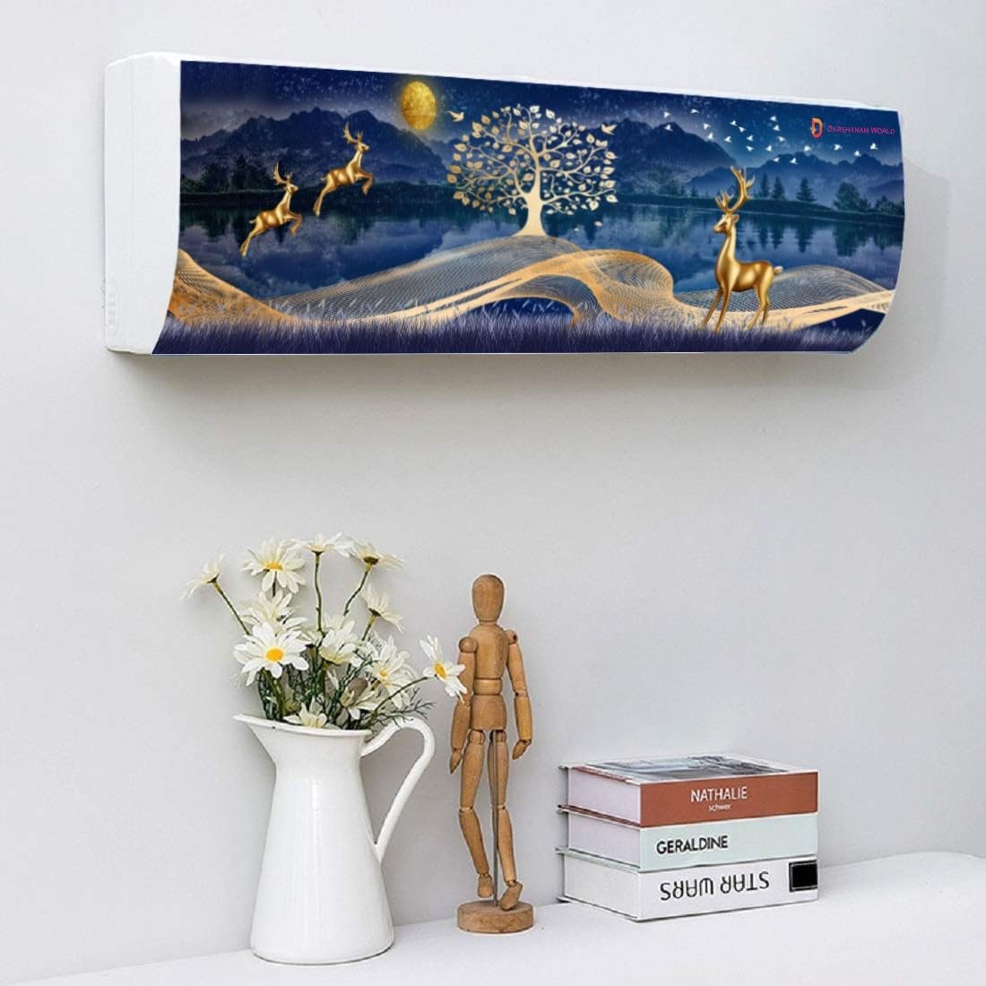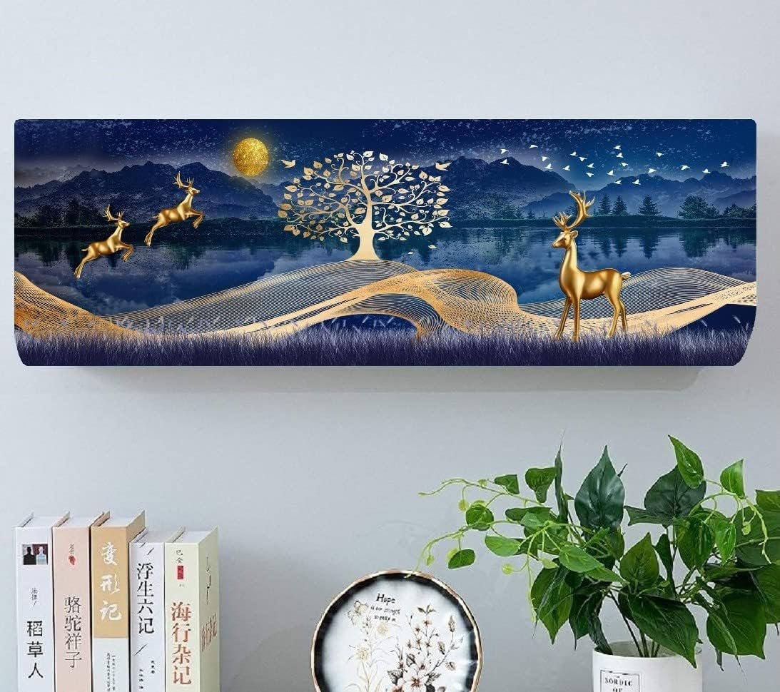 Elegant Living Room AC Cover With Golden Deer And Nature-Inspired Night Scenery, Designed To Protect Your Unit From Dust While Enhancing The Space With A Touch Of Luxury And Artistic Charm.
