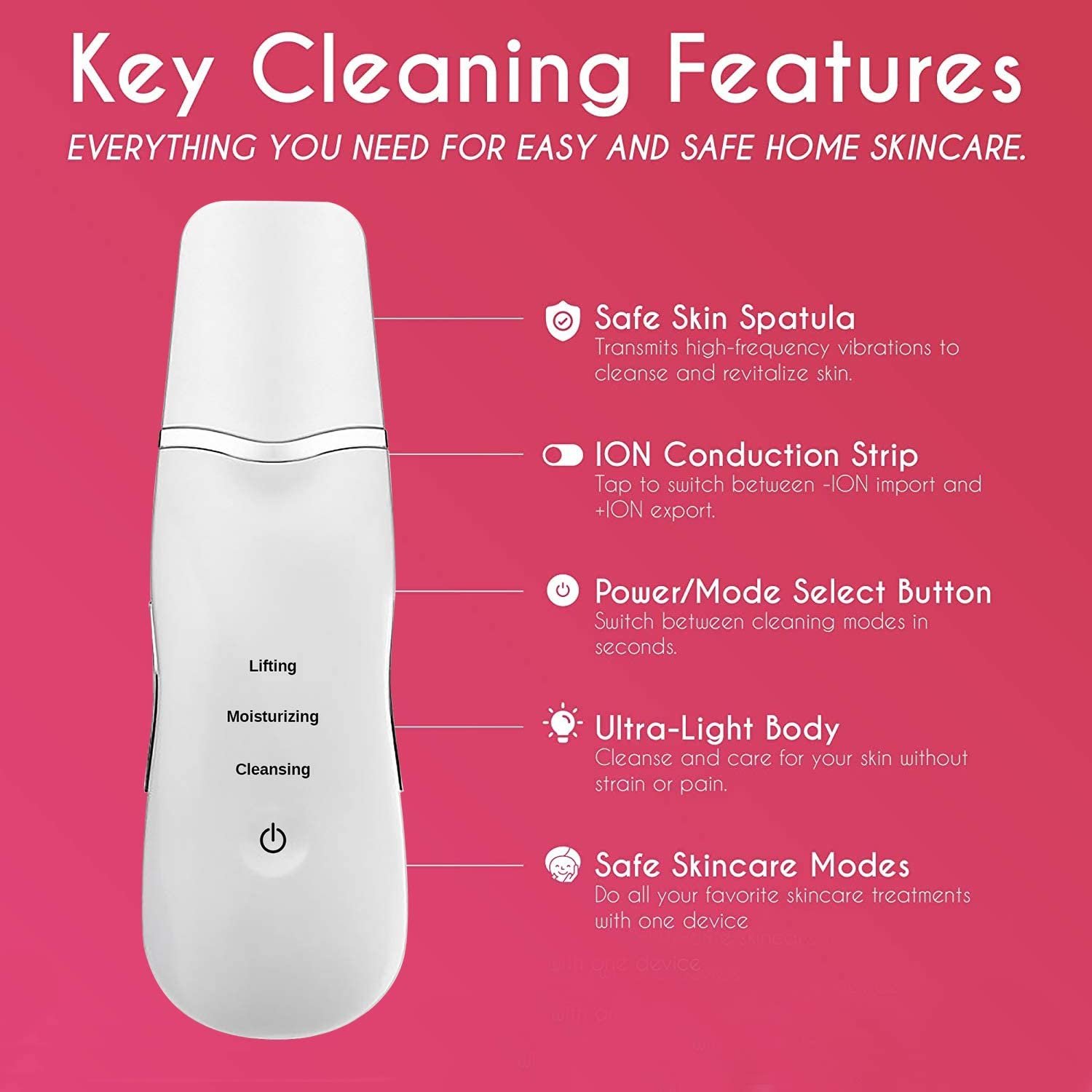 Ultrasonic Deep Cleansing Technology : Uses high-frequency ultrasonic vibrations to deeply cleanse pores and remove dirt, oil, and blackheads. Ideal for sensitive skin, this ultrasonic facial machine helps reduce acne and improve overall skin texture
