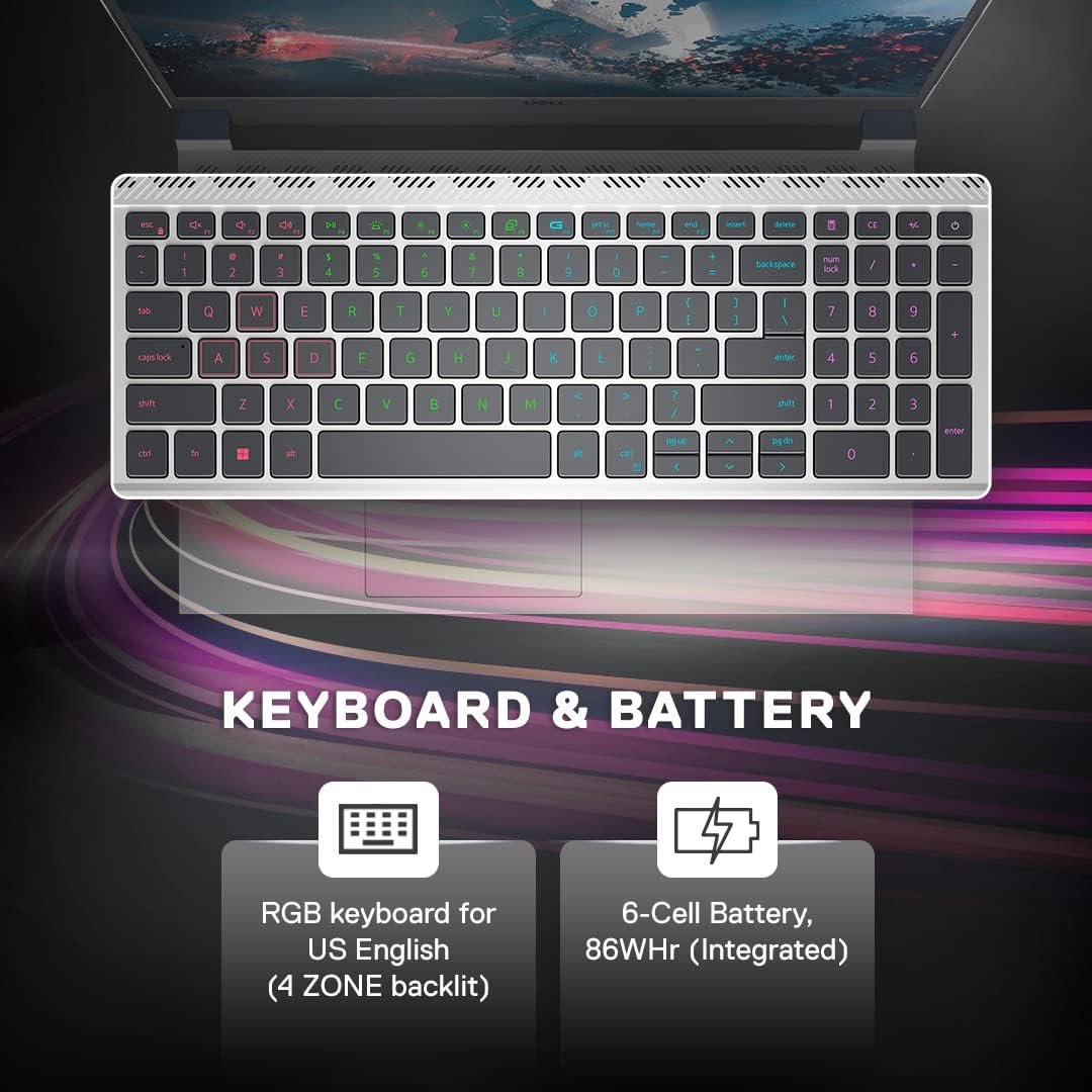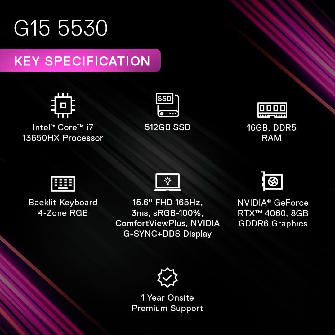 15.6″ FHD 165Hz, 3ms, sRGB-100%, ComfortViewPlus, NVIDIA G-SYNC+DDS Display13th Generation Intel Core i7-13650HX (14 Cores, 24MB Cache, 3.60 GHz Base, up to 4.90 GHz Boost,) ProcessorNVIDIA GEFORCE RTX 4060 with 8GB GDDR6 Graphics512GB Solid State Drive16 GB, 2×8 GB, DDR5, 4800 MHz MemoryBacklit Keyboard 4-Zone RGB