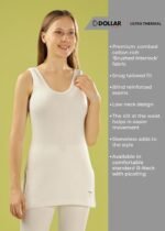 Dollar Thermal Ultra, a perfect blend of comfort, warmth, and style. Crafted from premium combed cotton rich ‘brushed interlock’ fabric, this thermal wear promises unmatched softness and durability, keeping you cozy on the coldest days. The snug, tailored fit enhances your silhouette while providing optimal insulation. Dollar Thermal Ultra features blind reinforced seams to prevent any irritation, ensuring a smooth, no-itch wear experience. The low neck design adds versatility, making it an excellent choice for layering under various outfits. Available in a comfortable standard round neck with picoting, this thermal wear caters to all your fashion needs. The sleeveless design adds a stylish touch, making it perfect for both indoor and outdoor wear.