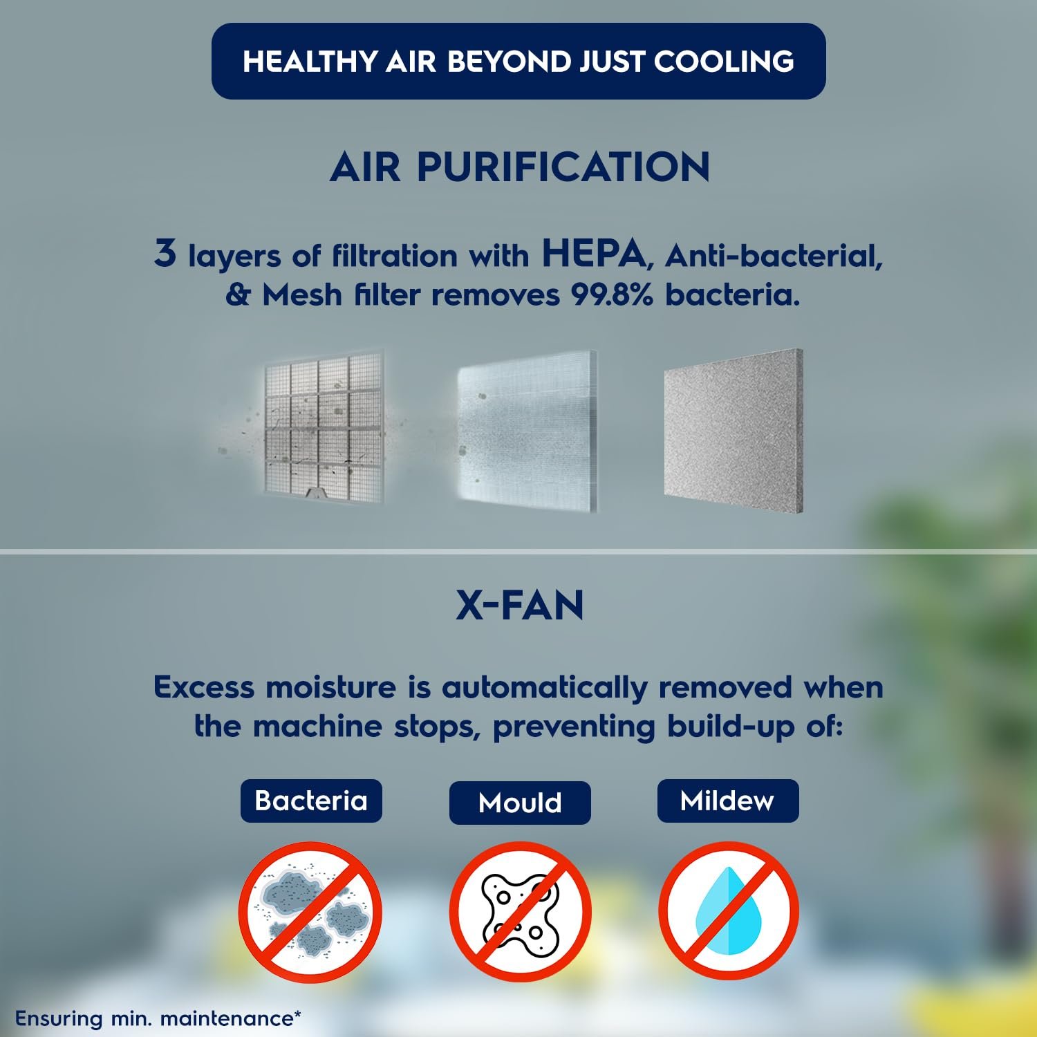 3-STEPS FILTRATION SYSTEM: It helps reduce up to 99.8% of harmful bacteria and keeps your home air healthier. With dust, antibacterial filter, and PM2.5 filter. This 1.5-ton air conditioner can clean up even the tiniest pollution and dust particles surrounding in air.