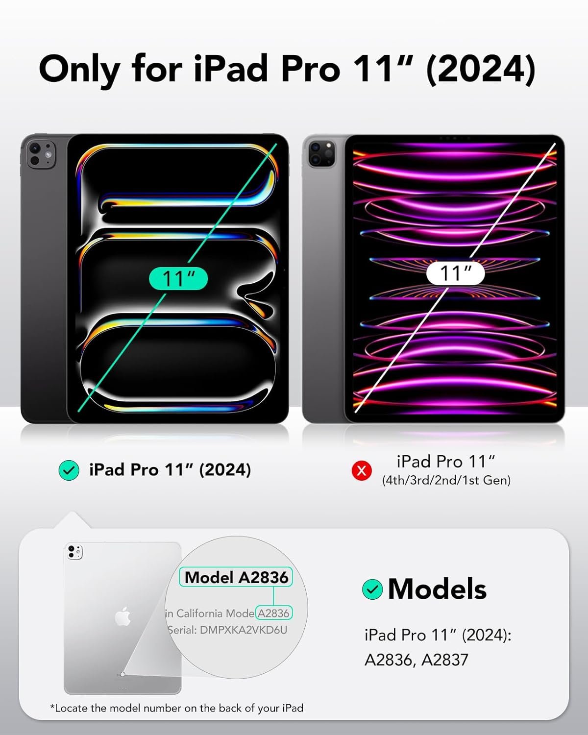 Compatibility: only for iPad Pro 11ʺ (5th Gen, 2024); models: A2836, A2837; not compatible with any other iPad models