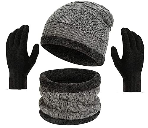 EVOLON DEALS Men Women Winter Knit Beanie Cap Hat Neck Warmer Scarf and Woolen Gloves Set Grey Color Combo of 3 Piece Set