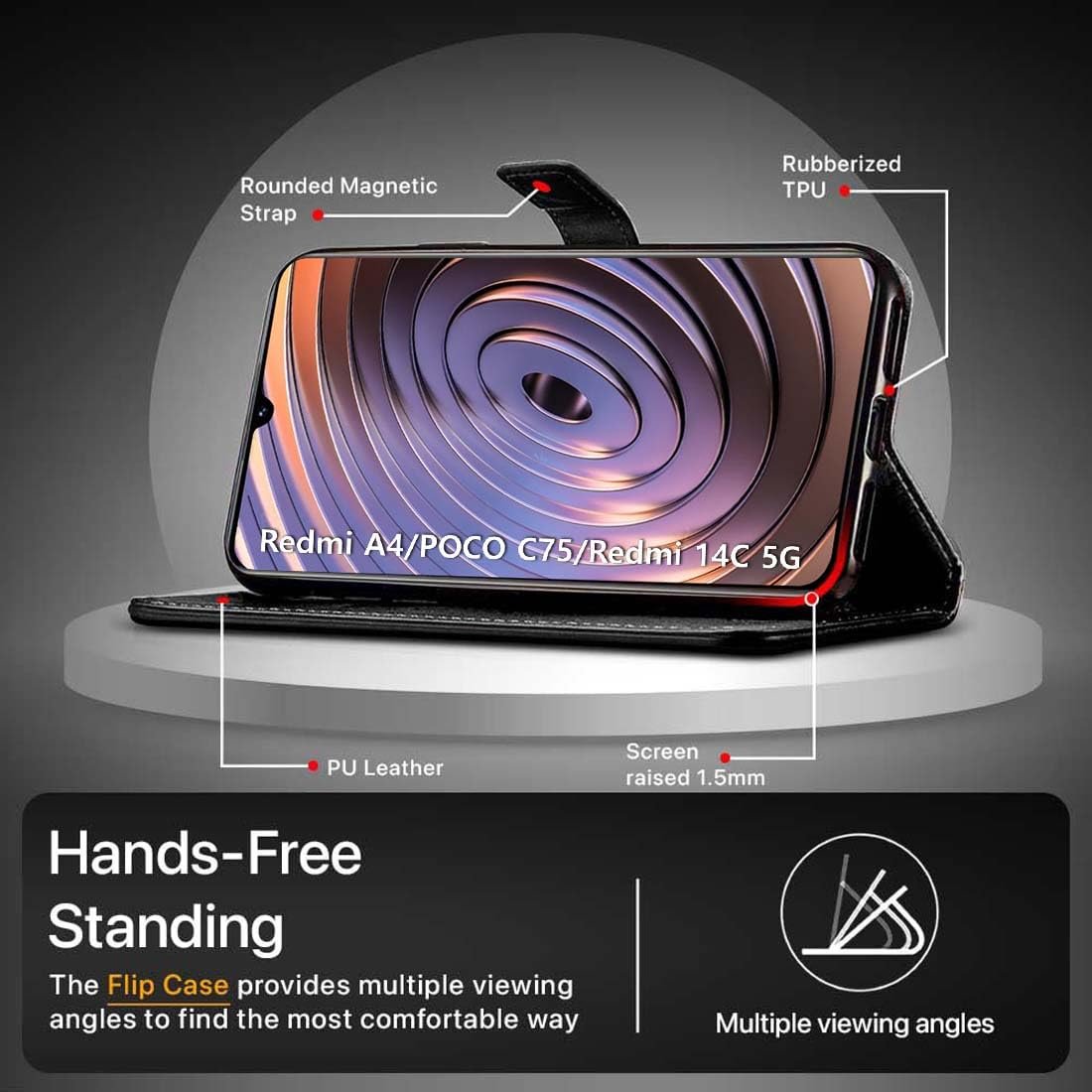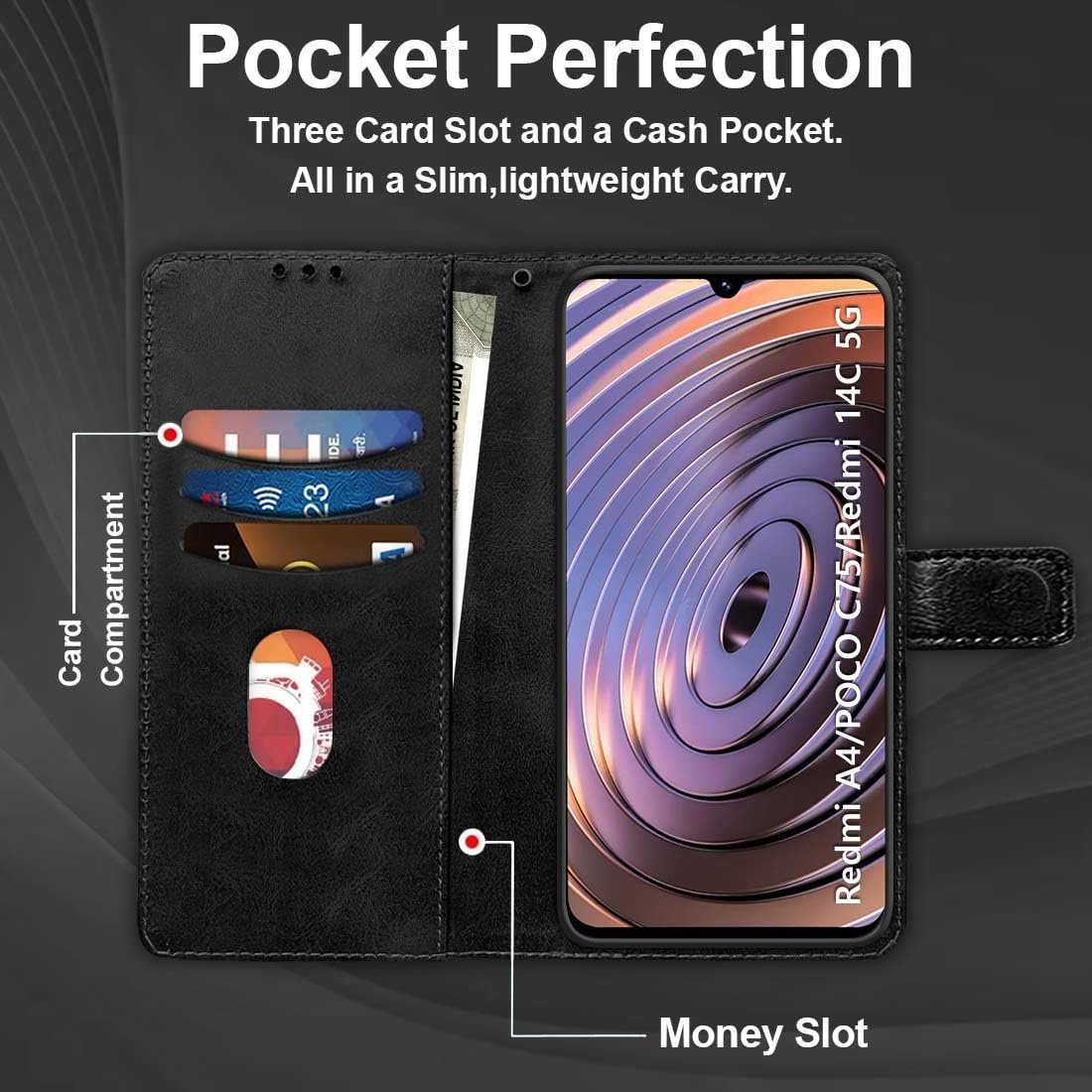 Fashionury Flip Back Case for Redmi A4 5G / Poco C75 5G / Redmi 14C 5G / Poco M7 5G | Leather Finish | Designer Button |Flip Back Case for Redmi A4 5G / Poco C75 5G / Redmi 14C 5G / Poco M7 5G (Black)