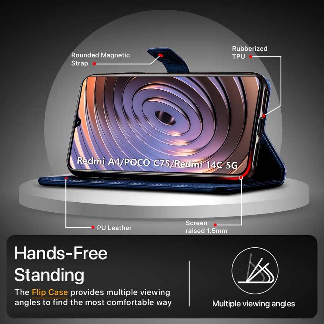 Fashionury Flip Back Cover Case for Redmi A4 5G / Poco C75 5G / Redmi 14C 5G / Poco M7 5G | Genuine Leather Finish | Designer Button | Inbuilt Pockets & Stand | Flip Back Case Cover (Blue)