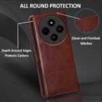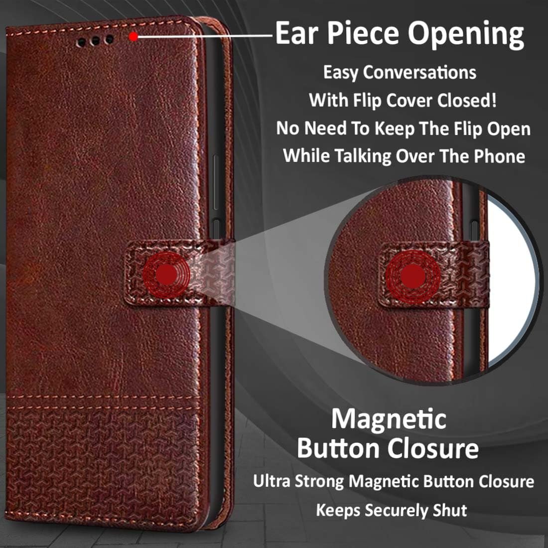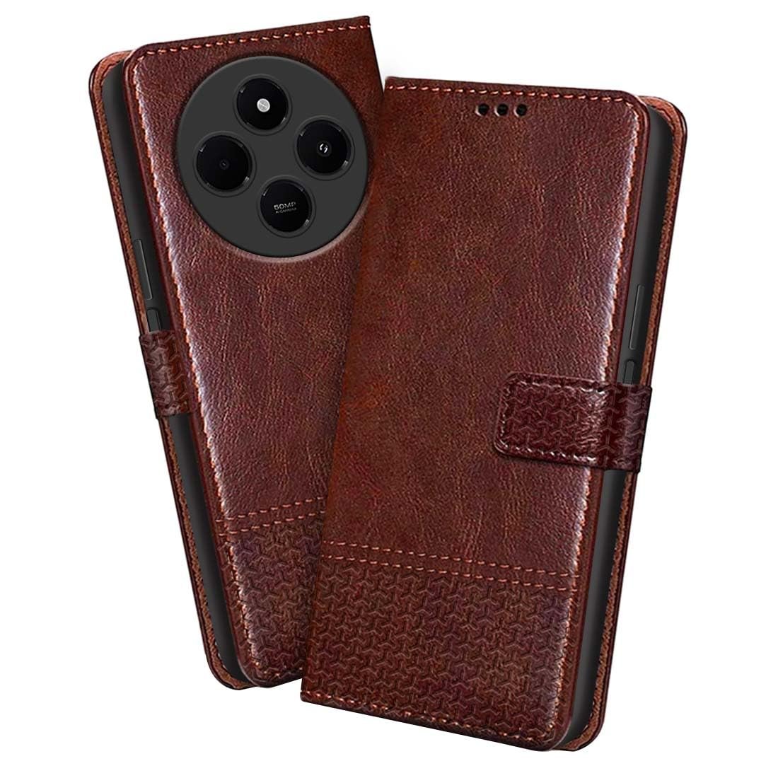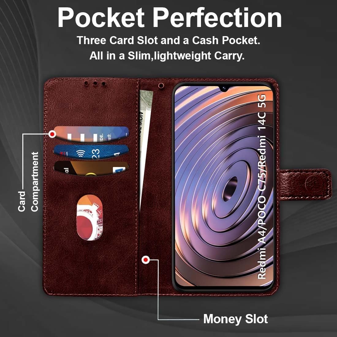 Fashionury Flip Back Cover Case for Redmi A4 5G / Poco C75 5G / Redmi 14C 5G / Poco M7 5G | Genuine Leather Finish | Designer Button | Inbuilt Pockets & Stand | Flip Back Case Cover (Brown)