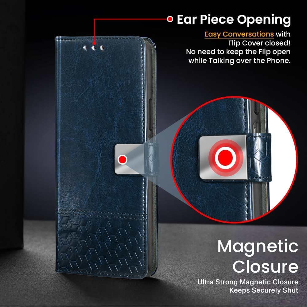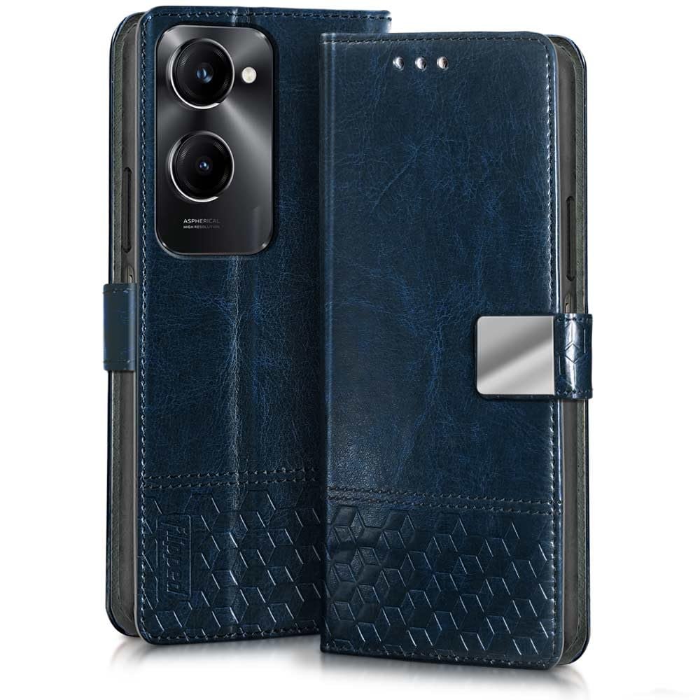 FLIPPED Honeycomb Design Back Flip Cover Case for iQOO Z9 Lite | Vivo T3 Lite 5G | Y18t | Y18 | Y18e | Y03 | Y28s | Y37 (Shock Proof | Leather Finish | Card Holders Wallet & Stand) – Tanned Blue