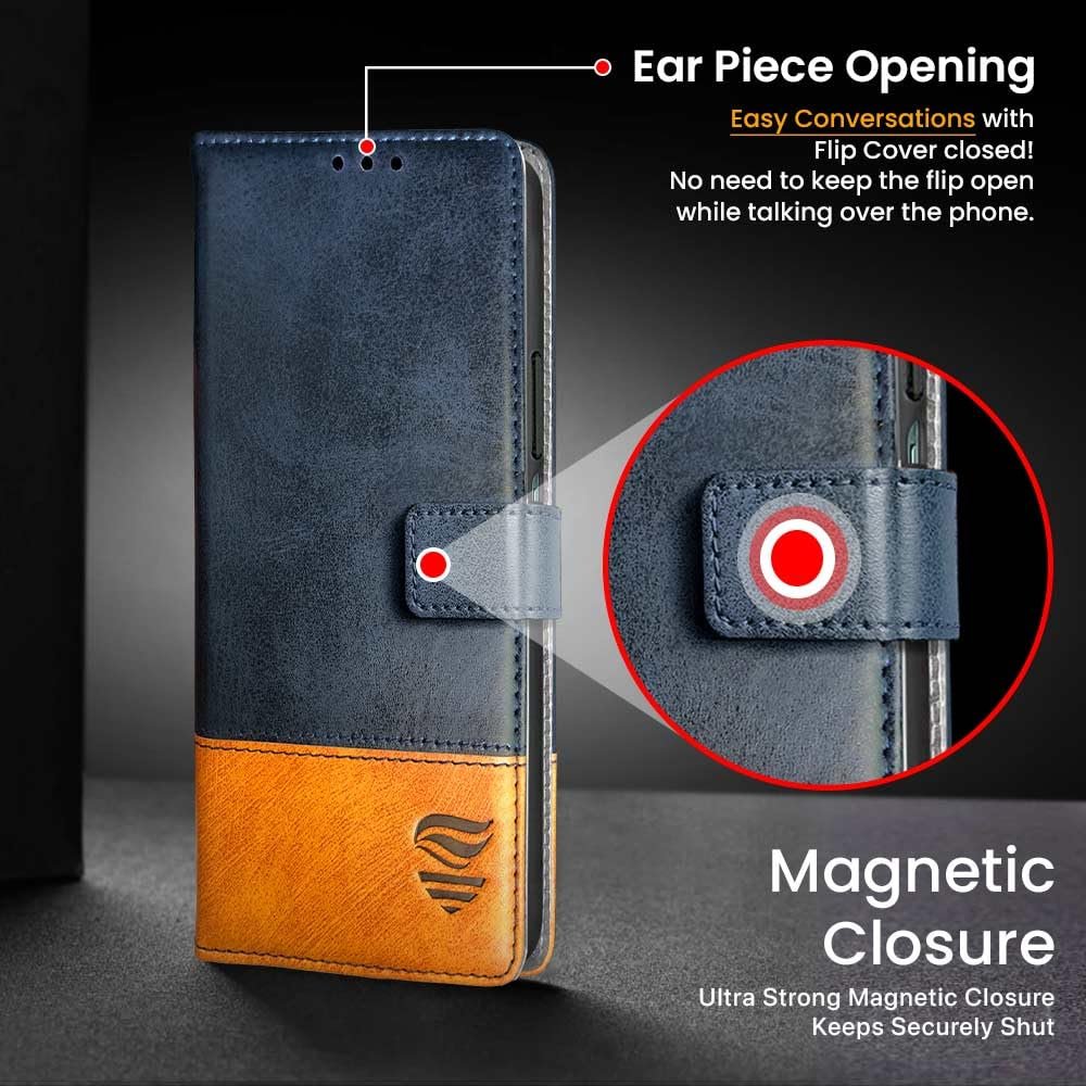 FLIPPED Vegan Leather Flip Case Back Cover for iQOO Z9 Lite | Vivo T3 Lite 5G | Y18t | Y18 | Y18e | Y03 | Y28s | Y37 (Shockproof | Hand Stitched | Card Wallet & Stand | Irish Blue with Tanned Oak)