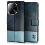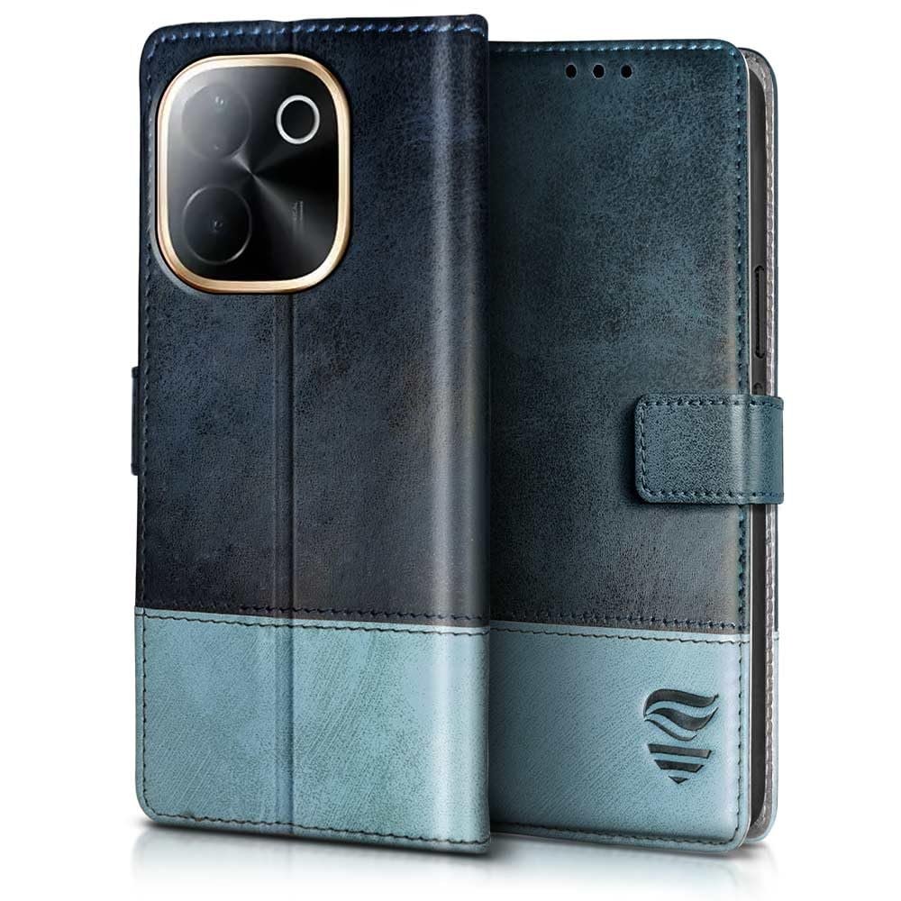 FLIPPED Vegan Leather Flip Case Back Cover for iQOO Z9s Pro 5G | Vivo T3 Pro 5G (Flexible, Shock Proof | Hand Stitched Leather Finish | Card Pockets Wallet & Stand | Blue with Aquamarine)