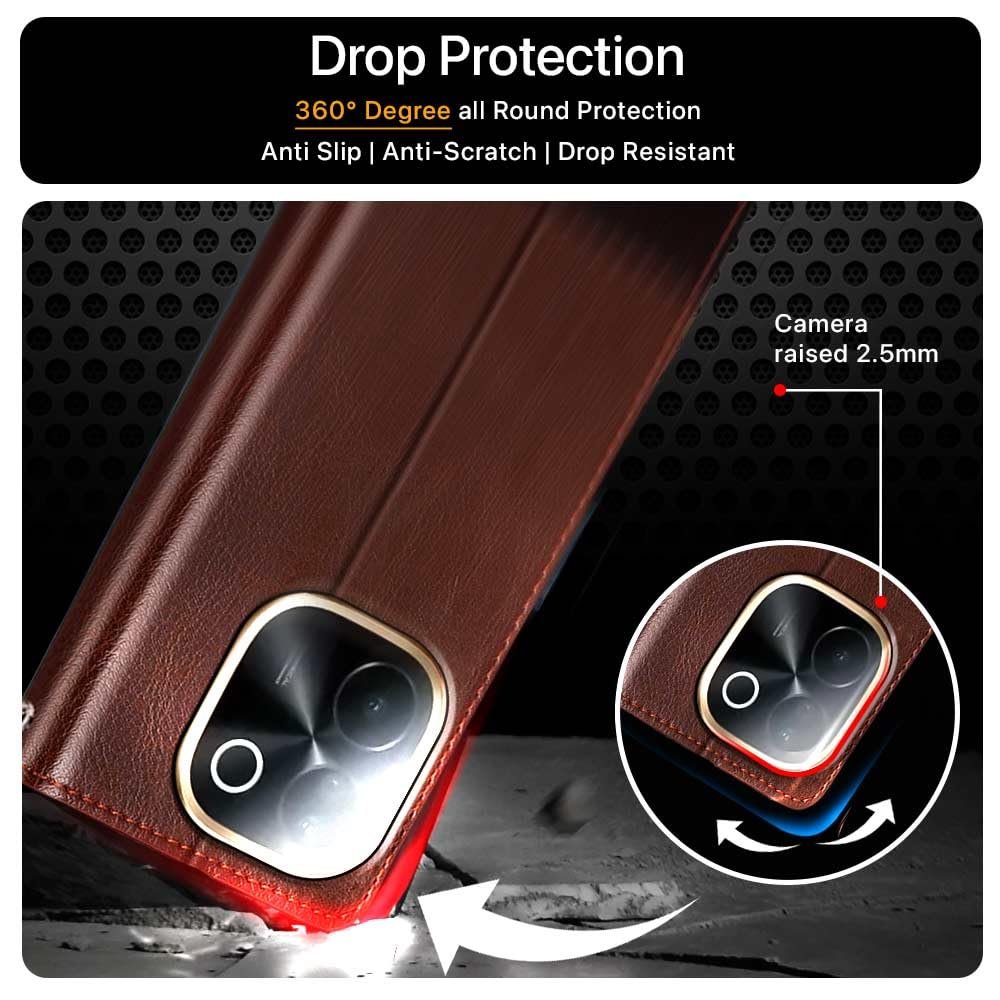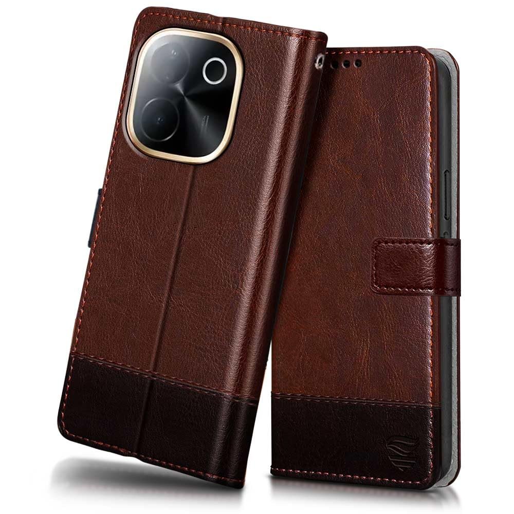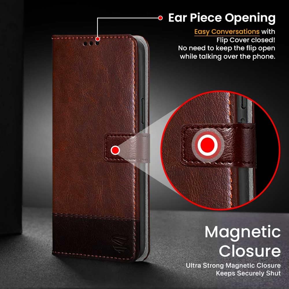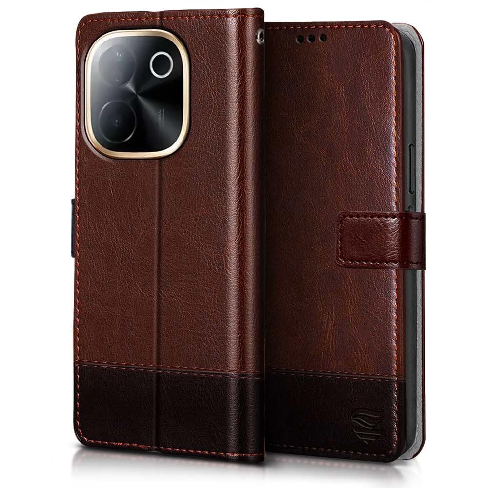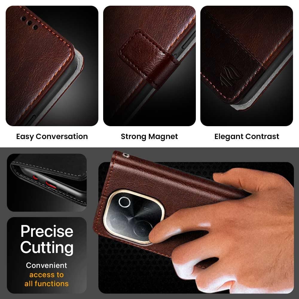 FLIPPED Vegan Leather Flip Case Back Cover for iQOO Z9s Pro 5G | Vivo T3 Pro 5G (Flexible, Shock Proof | Hand Stitched Leather Finish | Card Pockets Wallet & Stand | Brown with Coffee)