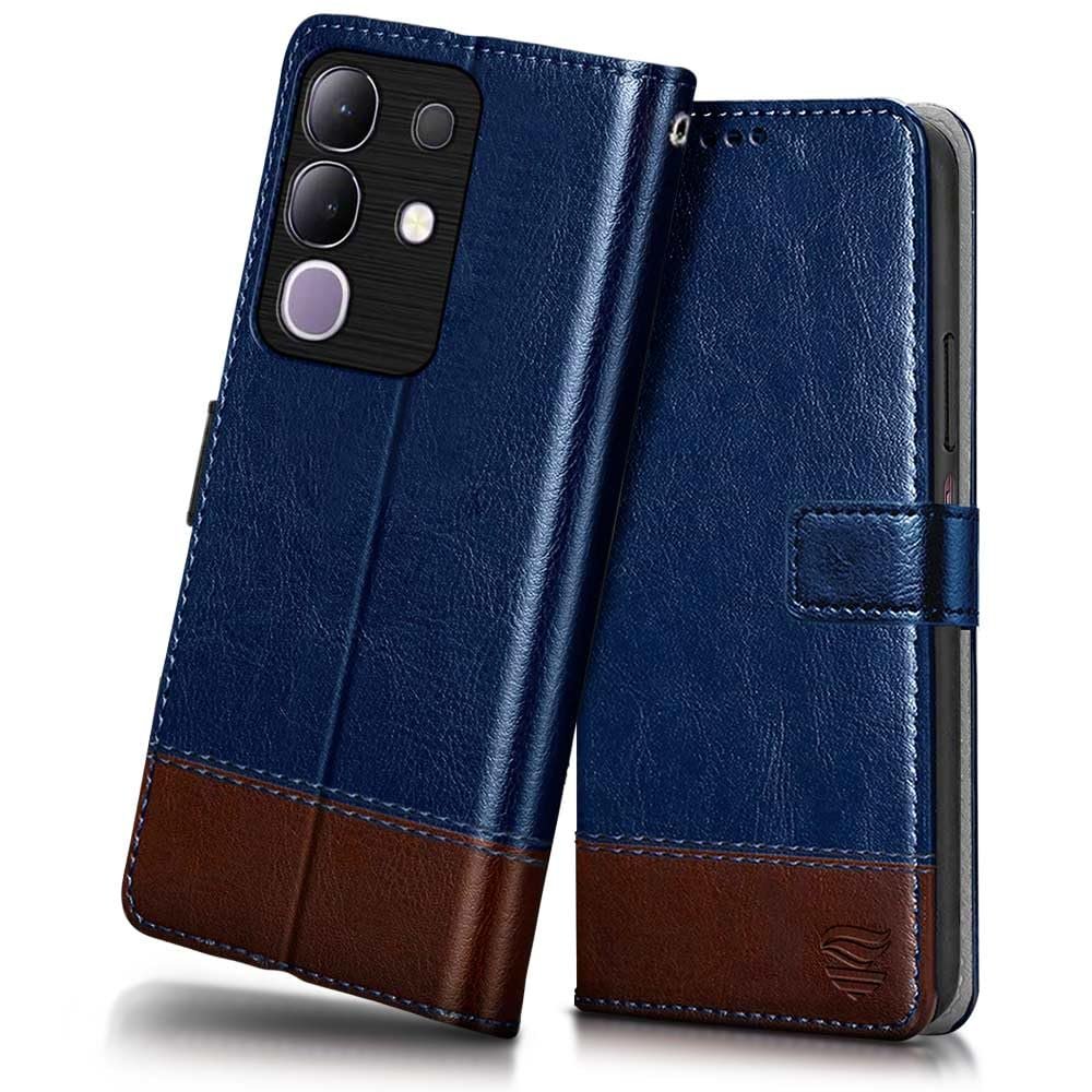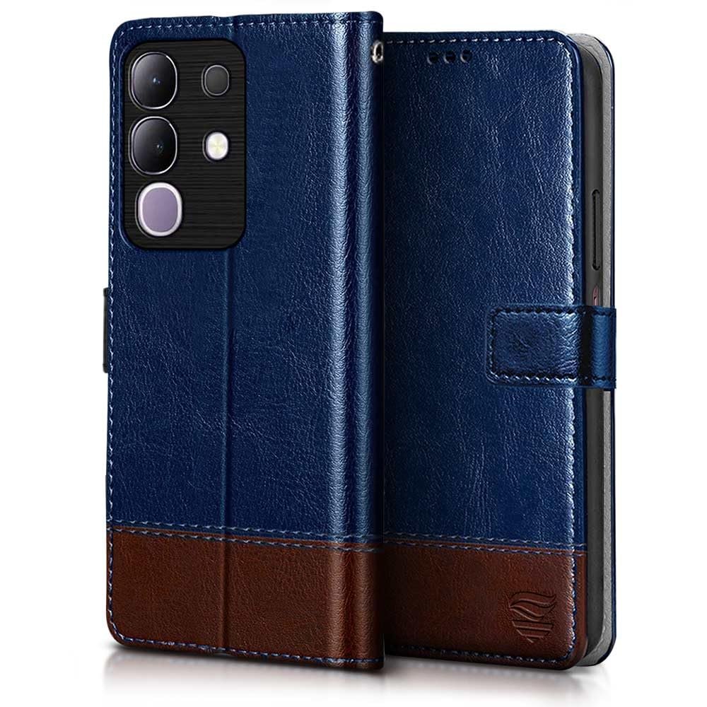 FLIPPED Vegan Leather Flip Case Back Cover for Vivo T4X 5G | IQOO Z10X 5G (Flexible, Shock Proof | Hand Stitched Leather Finish | Card Pockets Wallet & Stand | Blue with Brown)