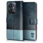 FLIPPED Vegan Leather Flip Case Back Cover for Xiaomi Mi Redmi 13C 5G | Redmi 13C 4G | Poco M6 5G | Poco C65 (Shock Proof | Hand Stitched | Card Pockets Wallet & Stand | Blue with Aquamarine)