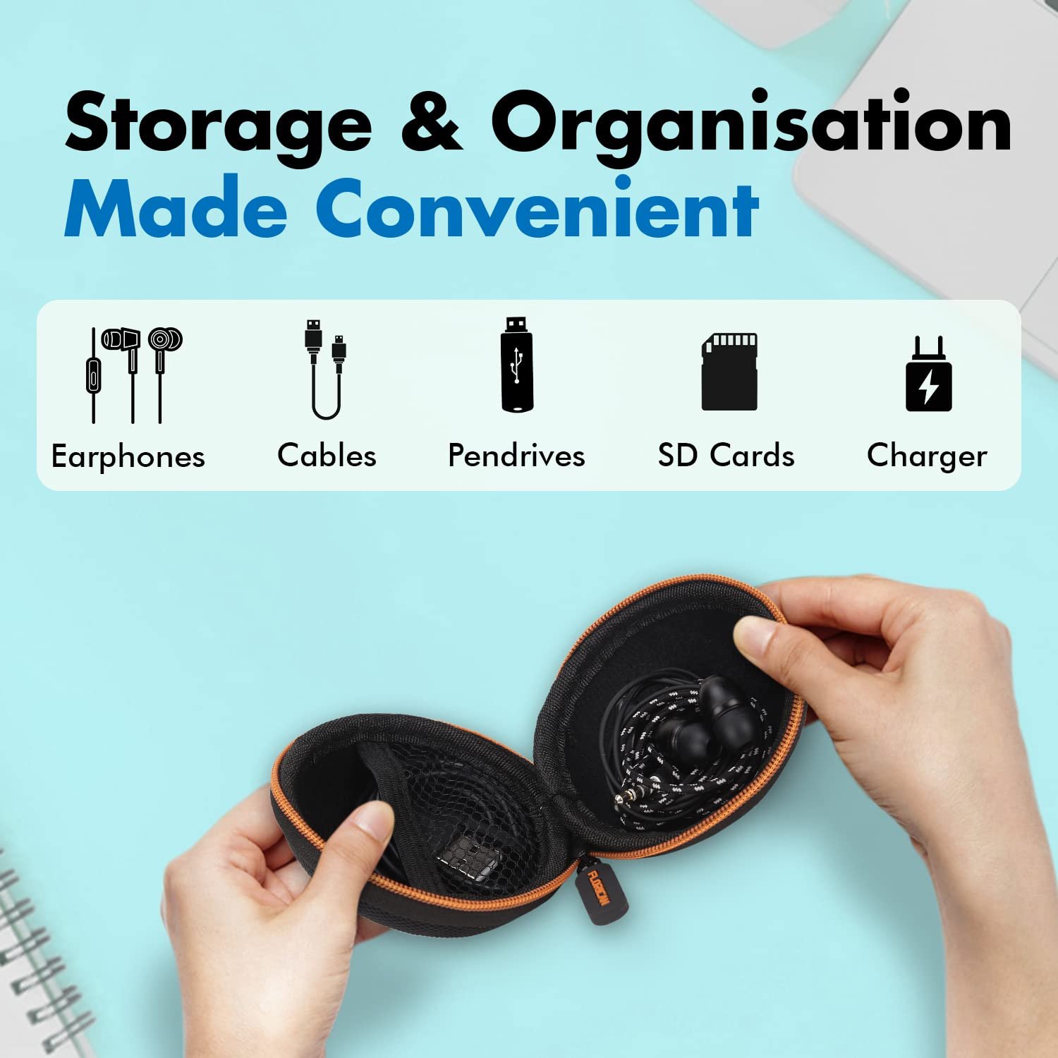 Florican Earphone Carry Case, Multi Use Storage Travel Organiser for Earphones, SD Cards, Pen Drives, Coins with in-Built Anti Scratch Mesh Pocket (Orange)