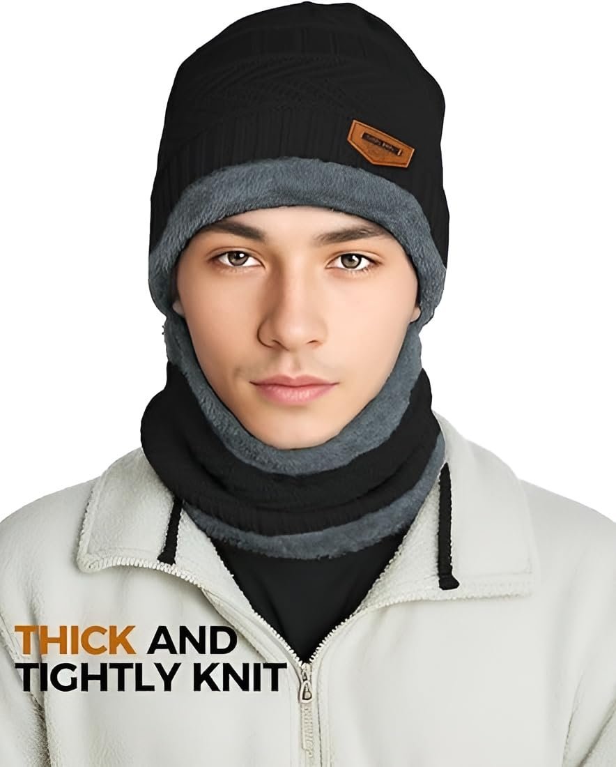 GARRY LEFFS Beanie Cap Neckwarmer Winter Combo for Men Women Skull Winter Woolen Knitted Inside Fur Mens Woollen Caps Muffler Scarf | Head & Neck Warmer| Black Color| 1 Set|