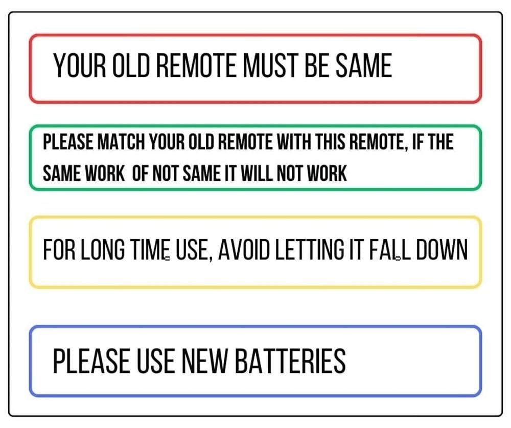 Remote must be Exactly same (Function to Function) as per your Old remote (Match properly before Ordering)