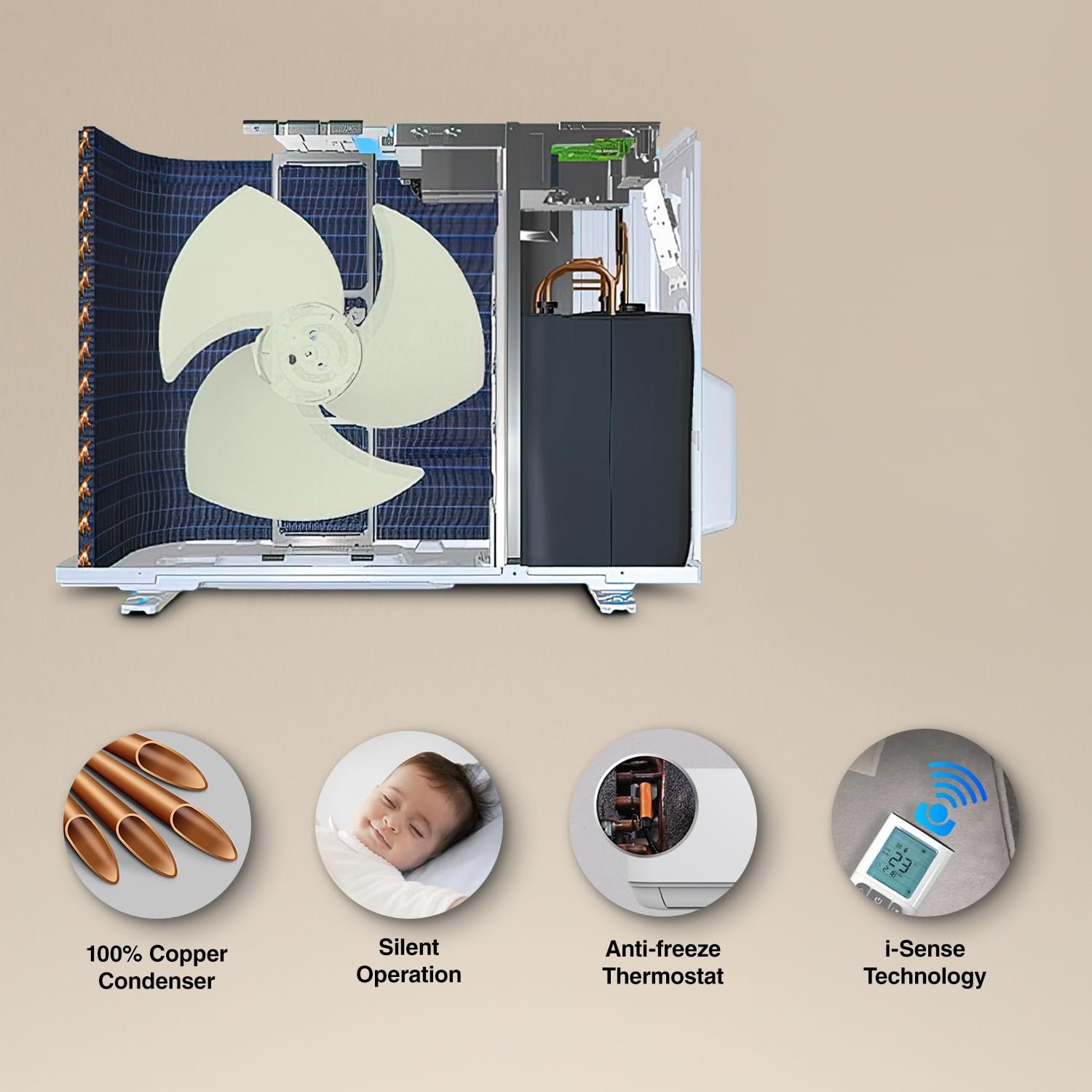 Condenser Coil: 100% copper evaporator and condenser with Blue Fin Anti-Corrosion coating that ensures durability and heavy duty performance for uninterrupted powerful cooling