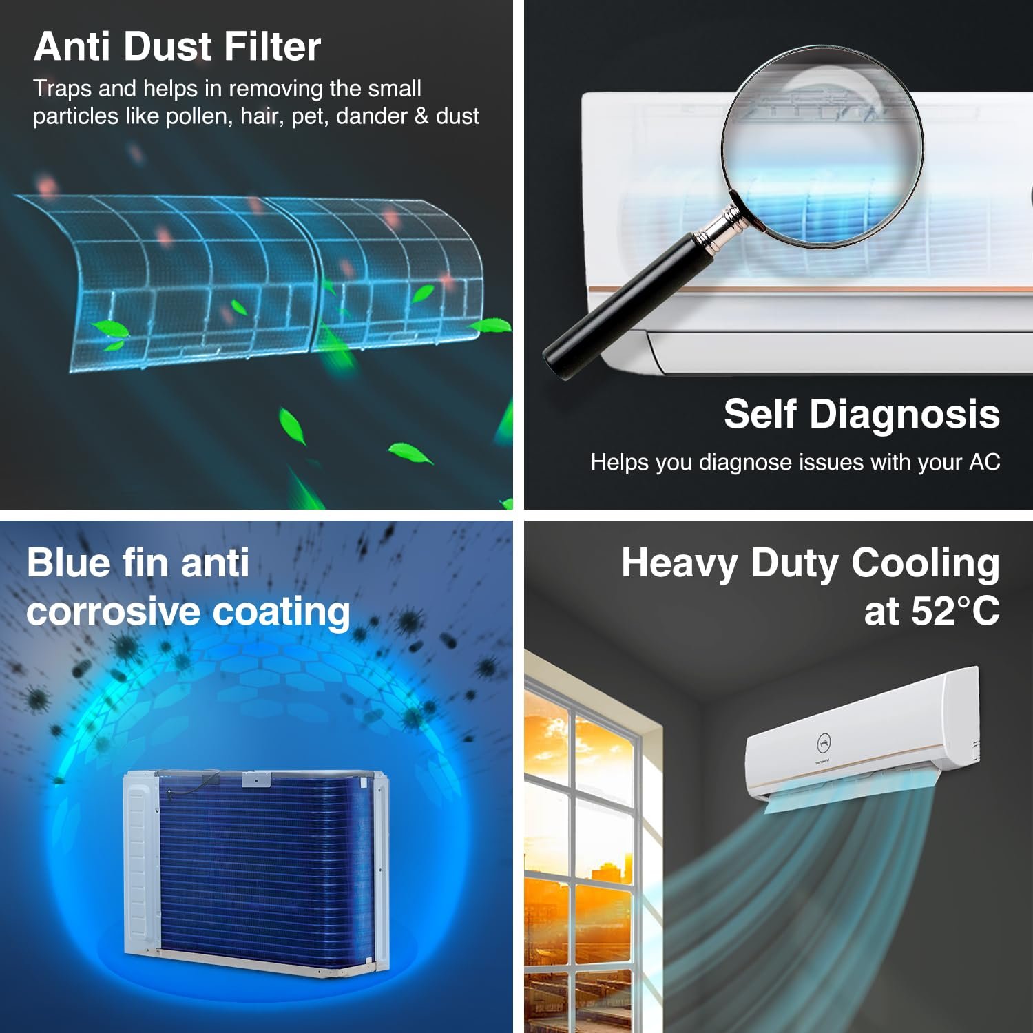 Capacity (1.5 Ton): Suitable for medium sized rooms (111 to 150 sq.ft), 675 CFM & Ambient Temperature: 52℃