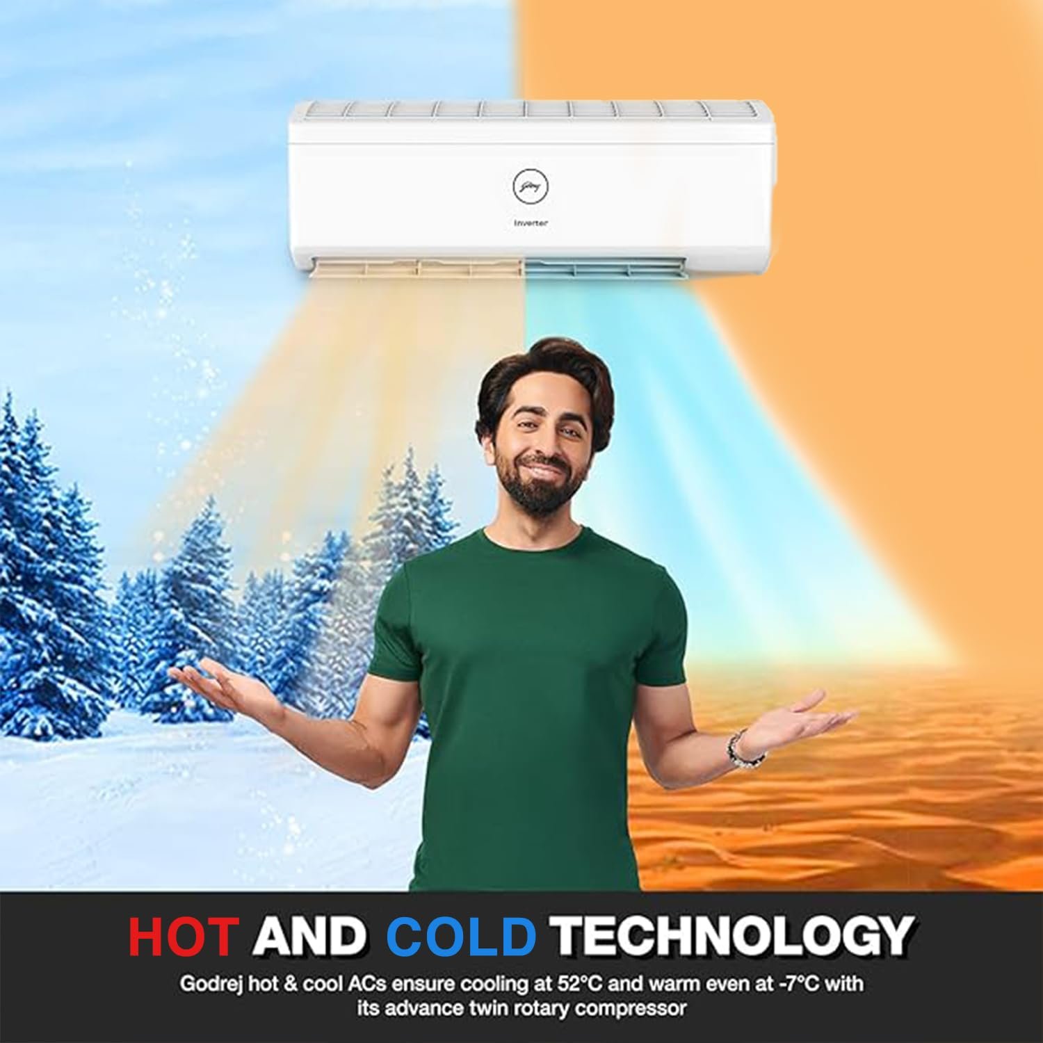 Hot & Cold Split AC with inverter compressor: Variable speed compressor which adjusts power depending on heat load. Ensures cold air during harsh summers of up to 52 ° Celsius and warm air even at sub-zero temperature of -7° Celsius.