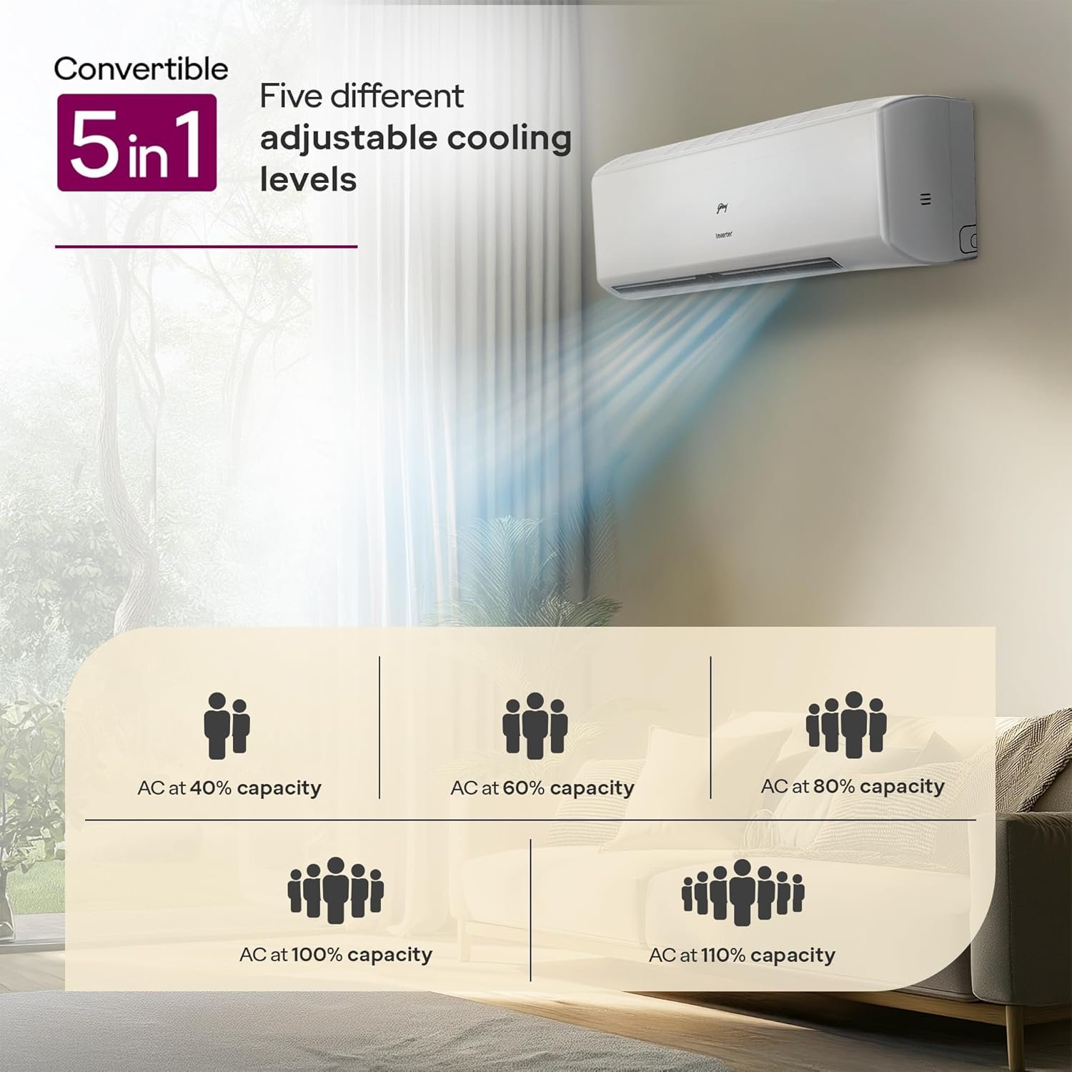 5-in-1 Convertible Split AC with inverter compressor: Variable speed compressor which adjusts power depending on heat load. Operates at a cooling capacity ranging from 40% to 110%, adjust cooling capacity at your convenience thus helps in saving energy.