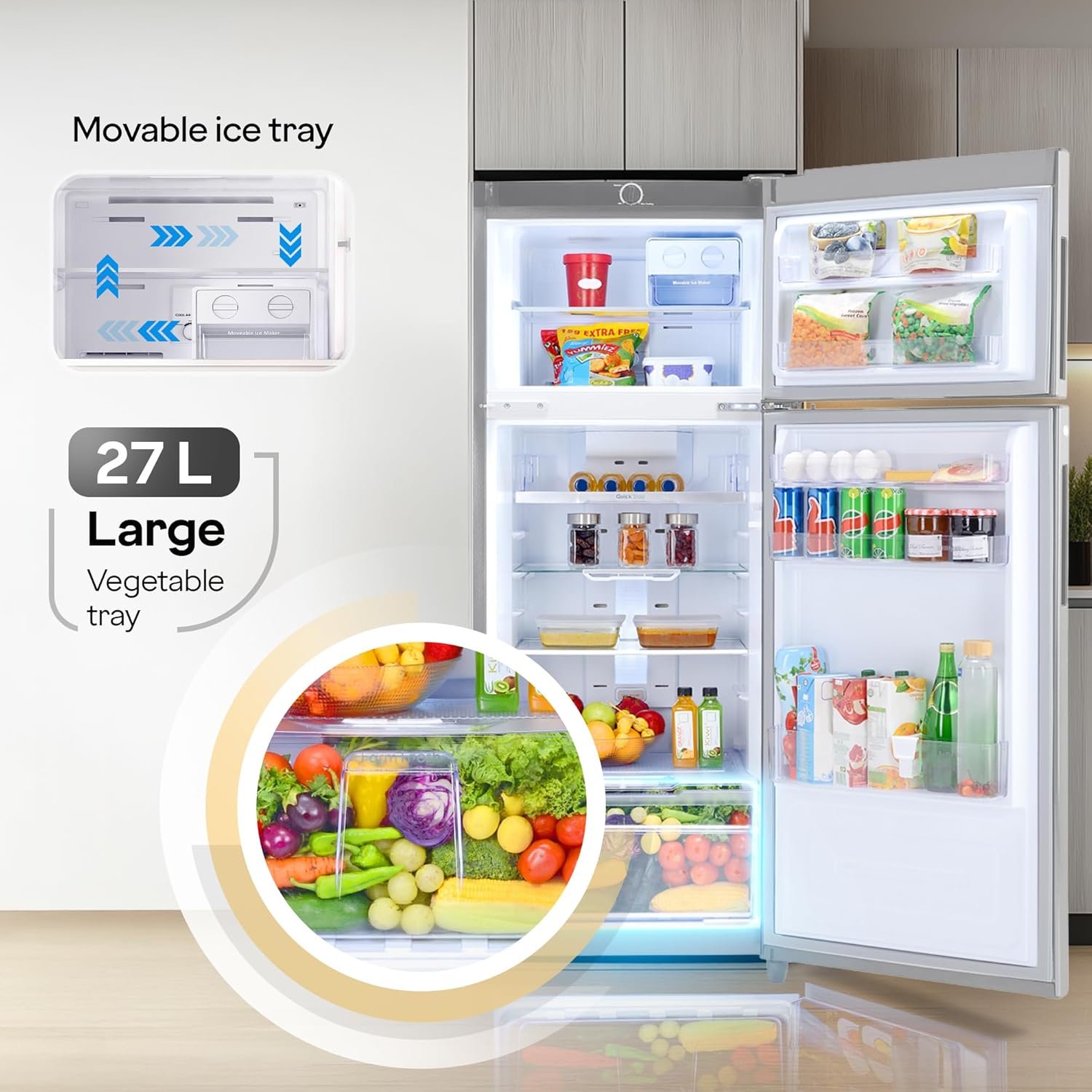 Special features: Farm Freshness up to 30 days, Nano Shield Technology, Cool Balance technology, Large Vegetable Tray, Movable Ice box, LED Prism lens