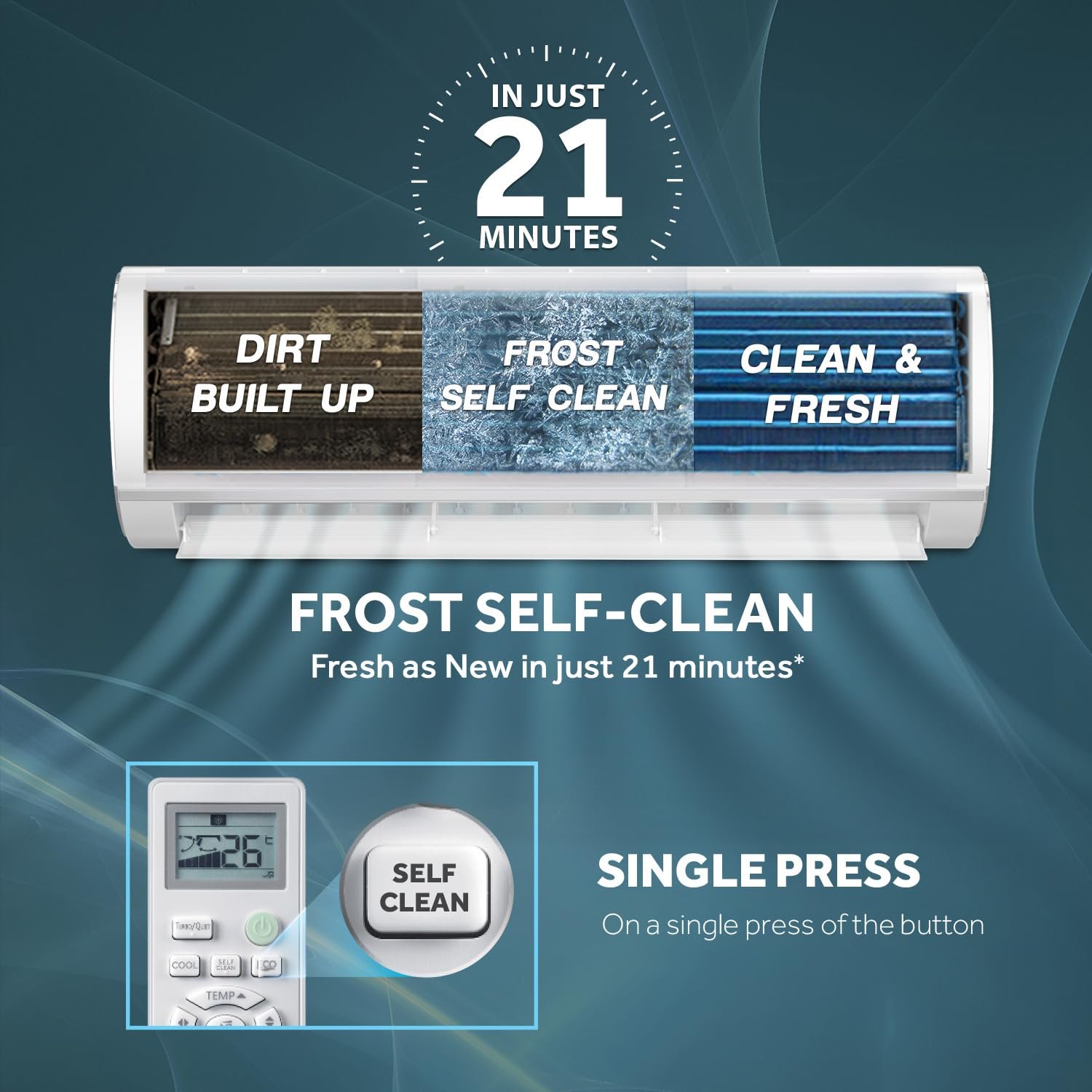Energy Rating: 3 Star Air Conditioner | ISEER: 3.85 | Annual Energy Consumption: 925 KWH | Inverter Split AC with Frost Self Clean: Complete indoor wet wash in just 21 minutes with press of a button. This air conditioner provides service engineer type cleaning that offers, 99.9% clean air and removes any odour, dust and bacteria.