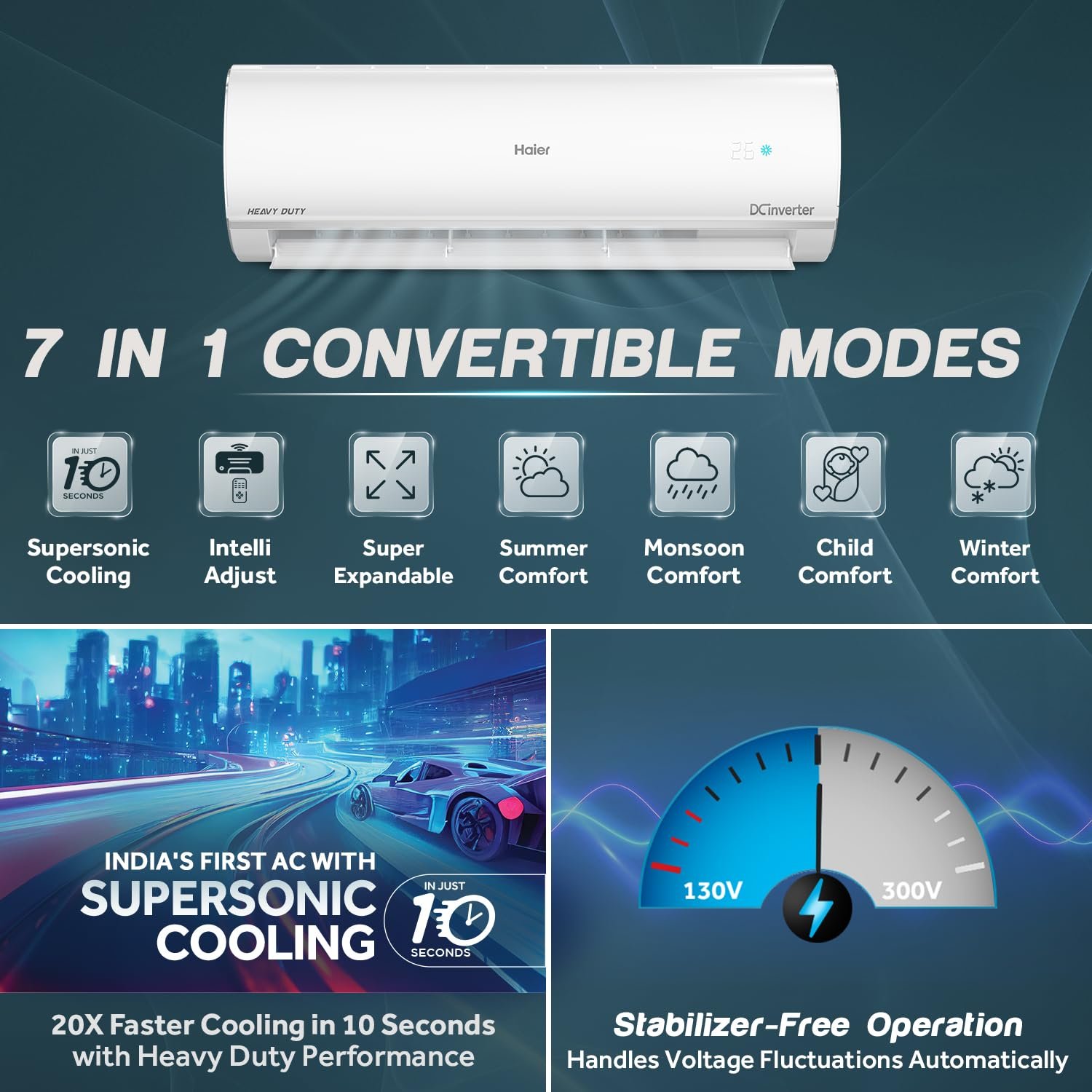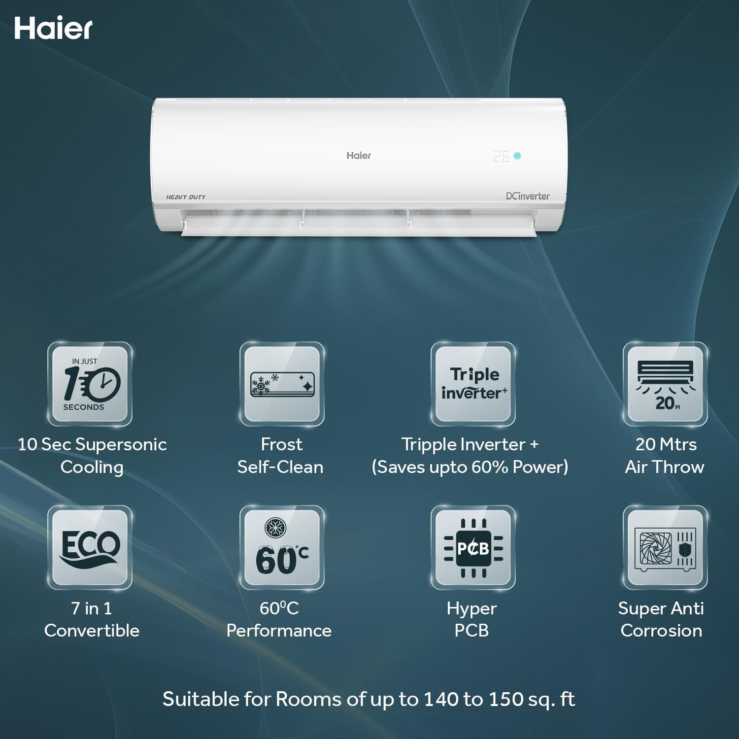 Key Features: Air Conditioner with Frost Self Clean | Inverter AC with Supersonic Cooling in Just 10 Sec | HEXA Inverter Split AC | Optimum Cooling at 60°C High Temperature | Hyper PCB for Stabilizer free Performance | Upto 20 Mtrs Air throw | 7 in 1 Intelli Convertible 3 Star AC.