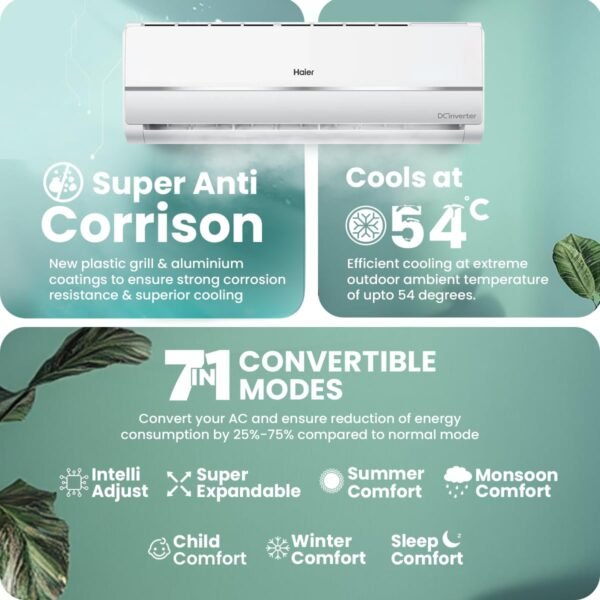 Special Features: Expandable 1 Ton Split AC | Upto 33% extra Air Circulation | Super Micro Anti Bacterial Filter Inverter AC | Super Anticorrosion| Energy Efficient 1 Ton Air Conditioner | ECO & Turbo Mode | Super Quiet Mode | Dark Mode | Hidden Display | Low Gas Warning | 2-Way Air Swing.