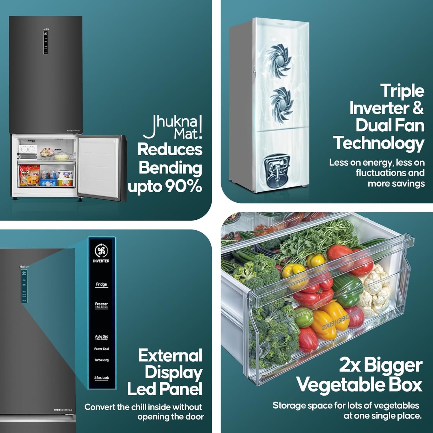 Haier 445 L 2 Star Frost Free Bottom Mount Double Door Refrigerator|Convertible 14-in-1|Jhukna Mat-Bottom Freezer|Digital Display Panel|Triple Inverter|Twist Ice Maker (HRB-4952BGK-P, Graphite Black)