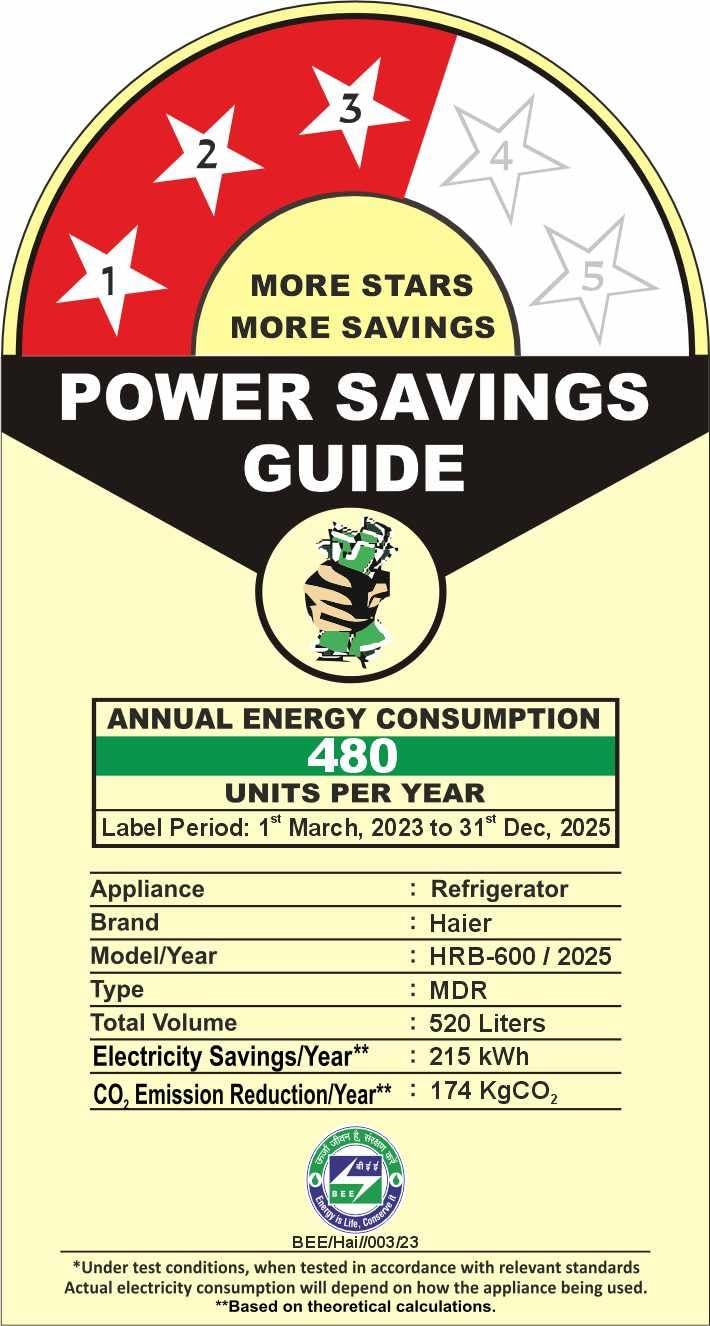 Energy Rating : 3 Star Energy Efficiency | Annual Energy Consumption: 480 Kilowatt Hours Per Year
