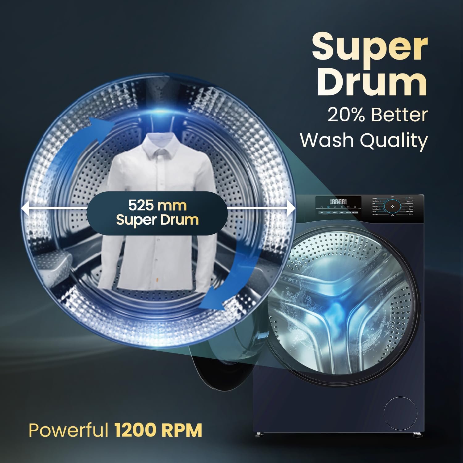 525mm drum offers more space, tangle-free laundry, and 25% better wash quality