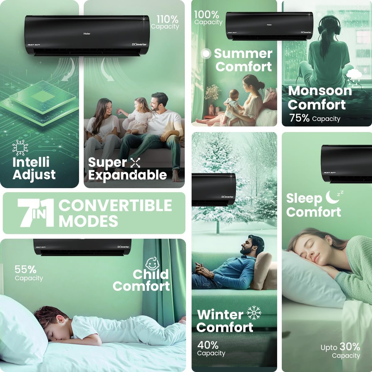 1.6 Ton 5 Star Smart Split AC with Hexa Inverter Compressor: Heavy Duty Full DC 1.6 Ton air conditioner designed for Indian climate. The 7-in-1 cooling mode allows capacity control (40% to 110%), saving up to 60% energy compared to other 1.5 Ton Split ACs