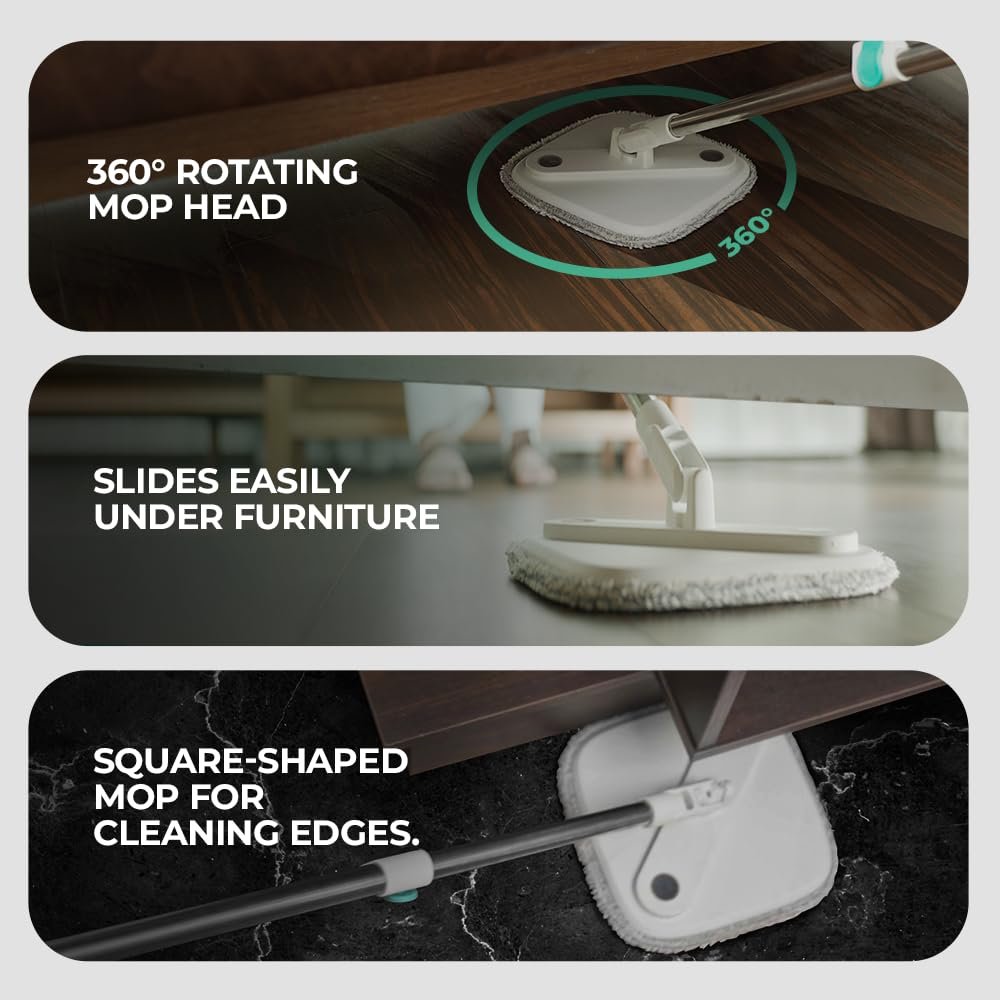 【Flexible 360 Rotating Mop】The 360° rotating mop head easily cleans under furniture like sofas, tables. The square-shaped design is perfect for reaching hard-to-clean spots like wall edges and corners.
