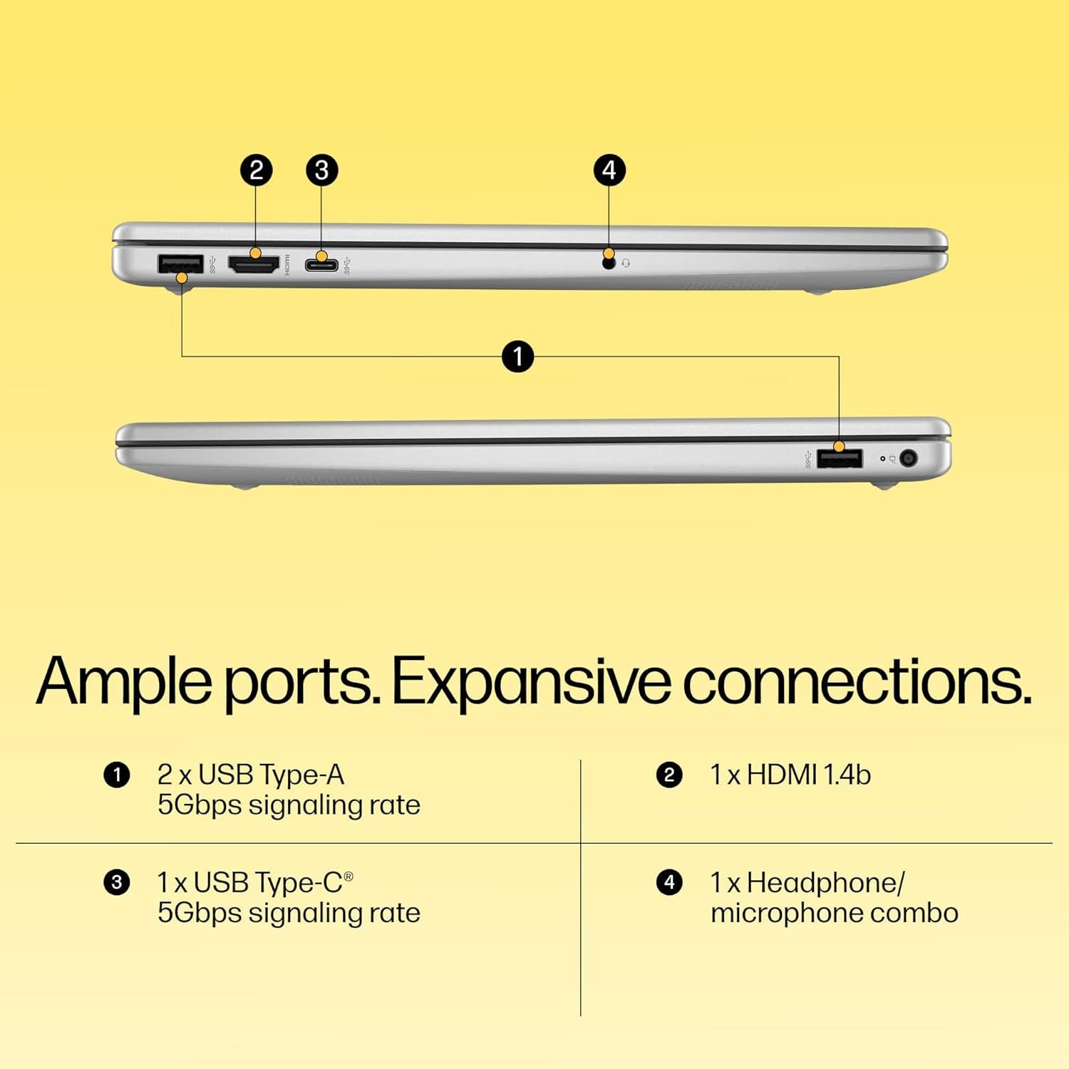 【AMD Radeon Graphics】micro-edge; Full-size, backlit, soft grey keyboard with numeric keypad, HP Imagepad; Wi-Fi 6 (1×1) and Bluetooth 5.3 wireless card; 1 USB Type-C 5Gbps signaling rate (supports data transfer only and does not support charging or external monitors); 2 USB Type-A 5Gbps signaling rate; 1 AC smart pin; 1 HDMI 1.4b; 1 headphone/microphone combo