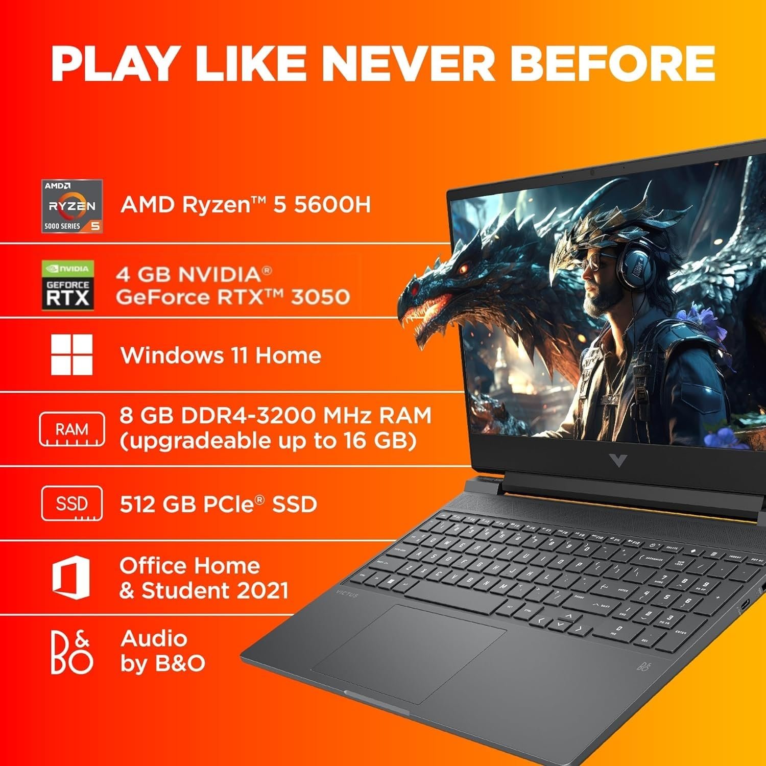 HP Victus, AMD Ryzen 5 5600H, 4GB NVIDIA RTX 3050 Gaming Laptop (8GB DDR4, 512GB SSD) 144Hz, IPS, 15.6″/39.6cm, Flicker-Free, Win11, Office 21, Mic Silver, 2.37kg, Enhanced Cooling, Backlit, fb0082AX