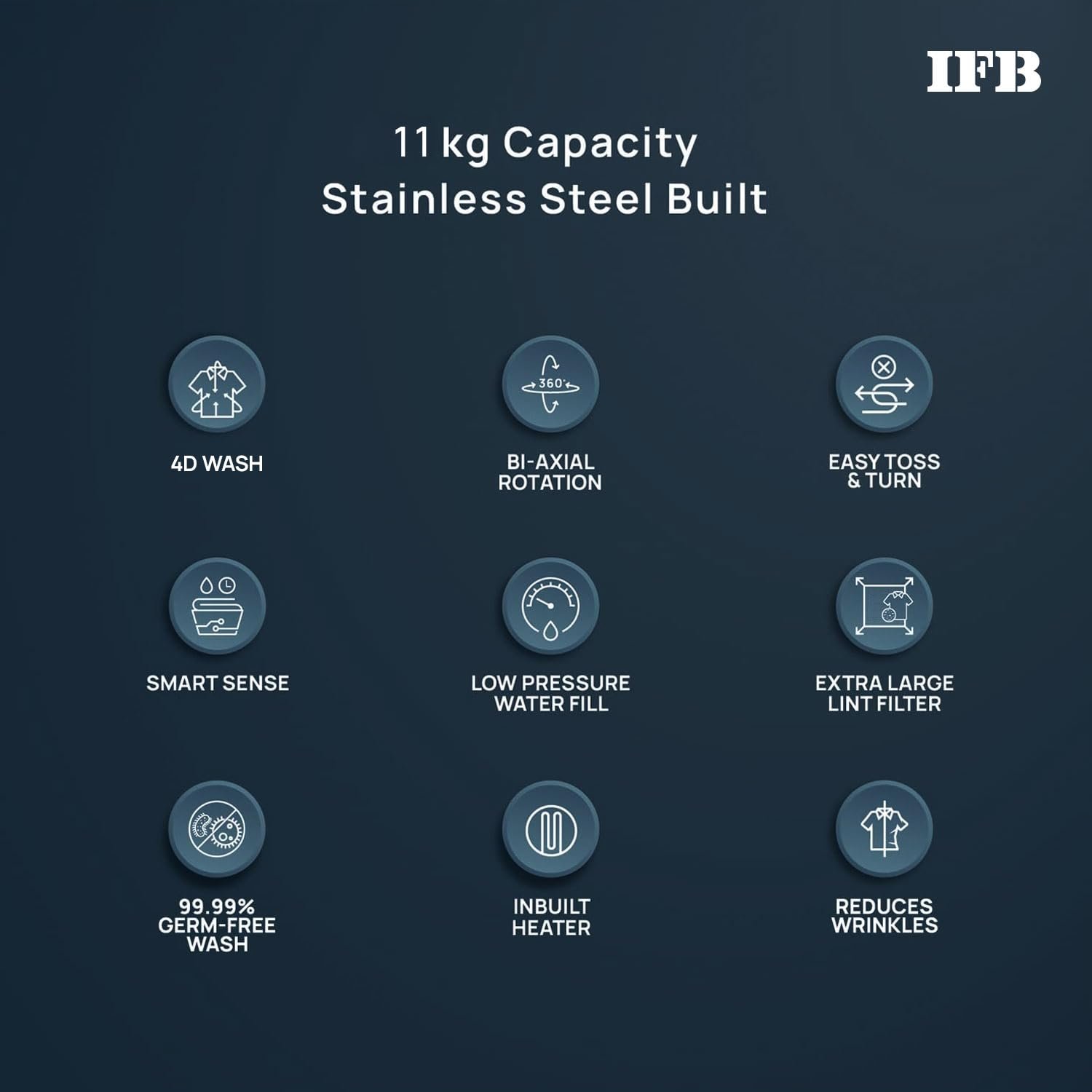 Aqua Energie : IFB’s patented Aqua Energie treats hard water to enhance detergent action, protect fabric color, and prevent fading. The machine is designed to work efficiently with water pressure ranging from 0.3 to 10 bar