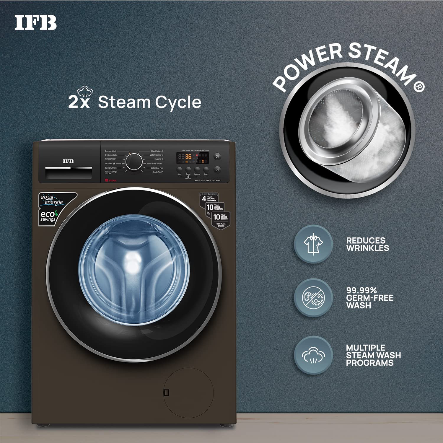 IFB 7 Kg 5 Star Front Load Washing Machine 2X Power Steam (ELITE MXS 7012, Mocha, In-built Heater, 4 years Comprehensive Warranty)