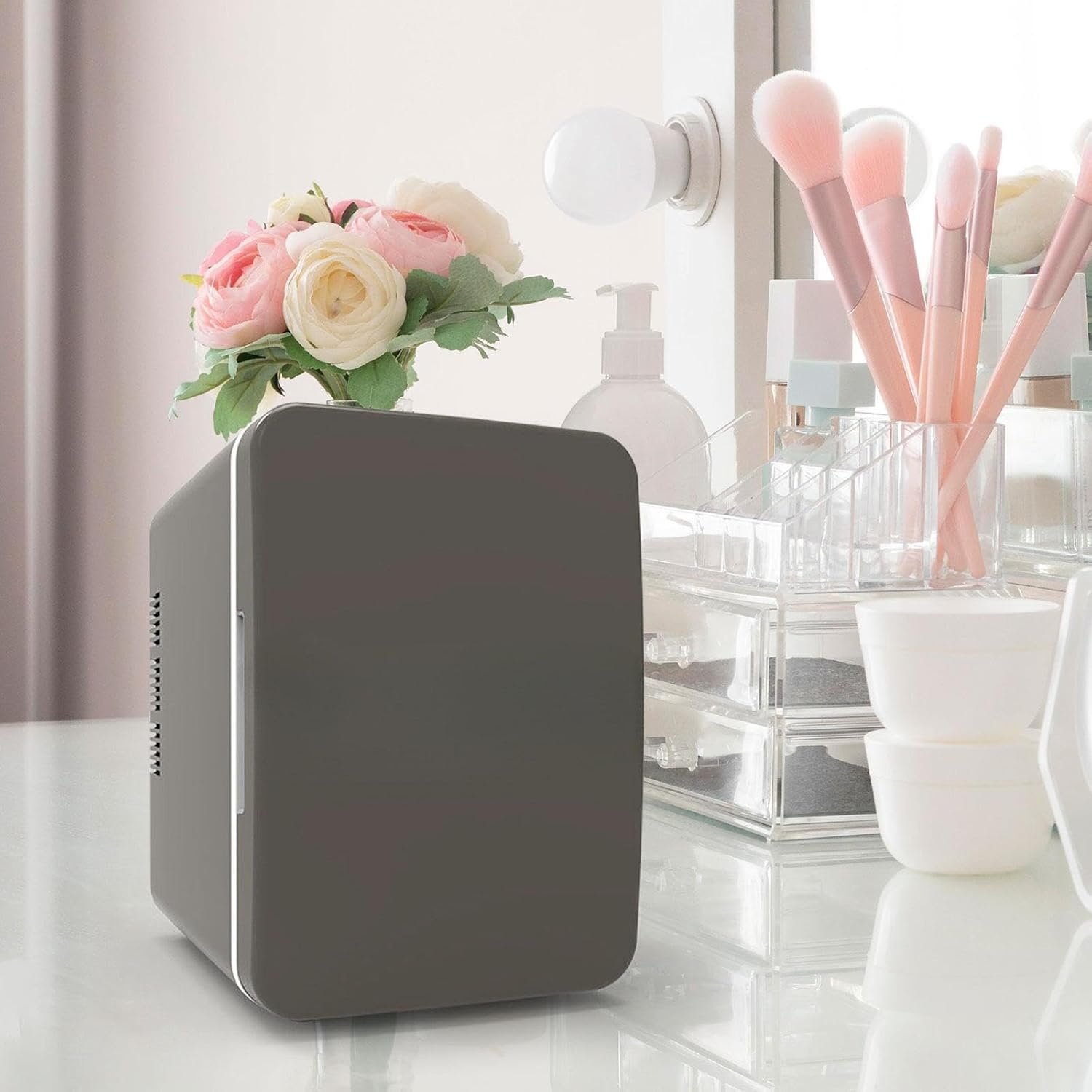 ? Save Space: Mini Fridge Has 4 Liter Capacity, Compact Size, 17.4Cmx24.3Cmx24.5Cm/6.85Inchx9.57Inchx9.65Inch, For Small Places Use.