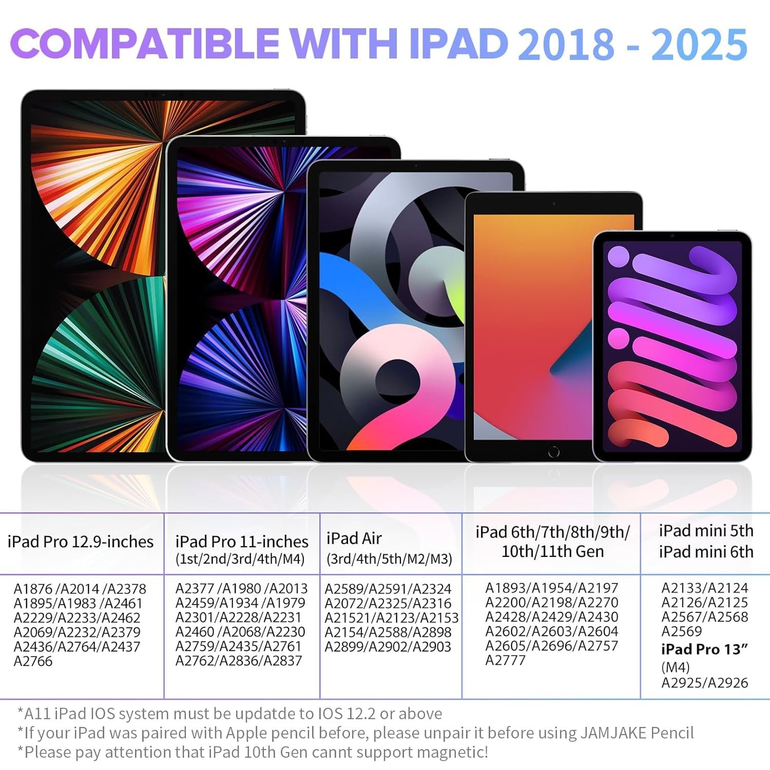 【Compatible with 2018-2025 iPad & iPad Pro】The stylus supports for iPad series 2018-2025 model: iPad Pro 13″ (M4), iPad Pro 12.9″(3rd/4th/5th/6th), iPad Pro 11″(All Generations), iPad Air M3/M2/5th/4th/3rd Gen, iPad 11th/10th/9th/8th/7th/6th, iPad Mini 6th/5th Gen. Please confirm your devices before you place an order, another model is invalid