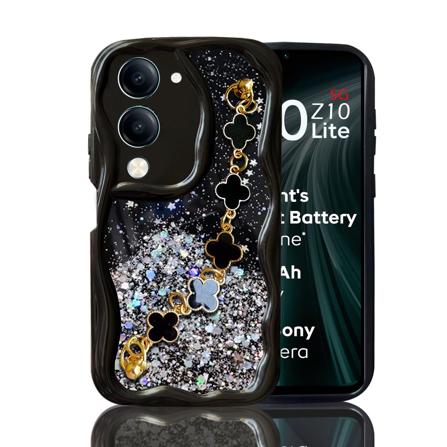 KC Back Cover for iQOO Z10 Lite 5G / Vivo T4 Lite 5G – 3D New Curly Wave Dry Fixed Starry Glitter Tiny Flowers Bracelet Chain Shockproof Soft Silicone Camera Protection Case (Black)