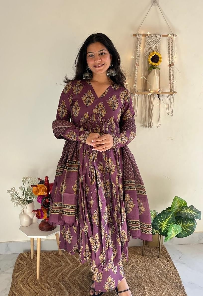 Customers find this kurti set to be of good quality, with superb anarkali pattern and print, and appreciate its comfort and soft, pure cotton fabric. The outfit is versatile, being suitable for both casual and daily wear, and customers like its fit and color quality, noting it has no color fade.