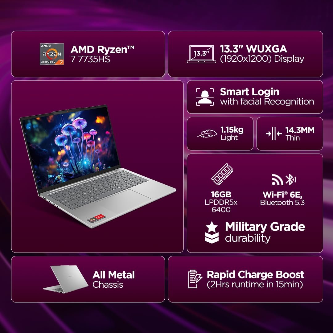 Lenovo IdeaPad Slim 5 Ryzen 7 7735HS (16GB RAM/512GB SSD/Integrated AMD Radeon 680M Graphics/WUXGA IPS Display/13.3″ (33.7cm)/Windows 11/Office Home 2024/Backlit KB/Grey/1.15Kg), 83J2000HIN Laptop