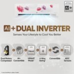 Key Features: Dual Inverter Compressor, AI+ Convertible 6-in-1, Energy Manager+, VIRAAT Mode, LG ThinQ (Wi-FI), Voice Control with amazon Alexa & Google Assistant, HD Filter with Anti-Virus Protection, HimClean, ADC Sensor, Cools at 55⁰ C, Stabilizer free operation within 120V-290V voltage range , Temperature Display type – Magic Display (LED) for temperature and timer modes, 15 MTS Airthrow, Noise Level: IDU – 31 (db) & ODU – 56 (db)
