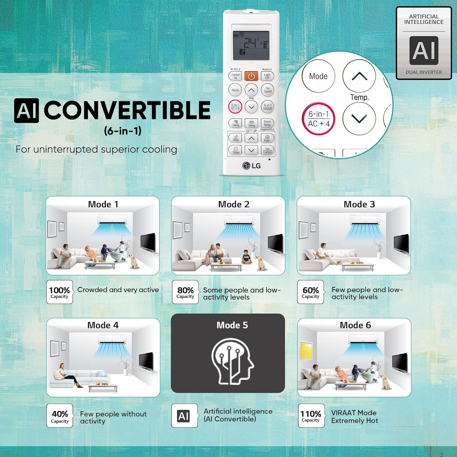 With AI Convertible 6-in-1 cooling, the user gets the flexibility to increase or decrease cooling capacity as per the requirement