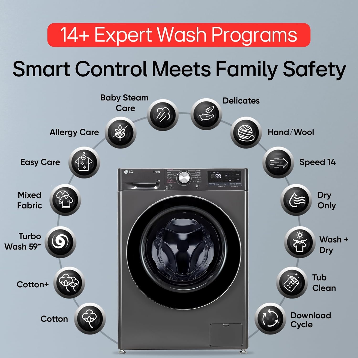 Wash Programs: 14 No. of Programs – Cotton: For normally soiled cotton clothes; Cotton+; TurboWash 59: Full cycle in 59 minutes; Mixed Fabric: Simultaneously washes mixed fabrics; Easy Care: For polyamide, acrylic, polyester; Allergy Care: Minimizes allergens; Baby Steam Care: Removes food stains from baby clothes; Delicate: For delicate fabrics like silk and wool; Hand/Wool: For hand-washable and delicate clothes; Speed 14: 14-minute wash for lightly soiled small loads; Dry Only: Automatic drying for most loads; Wash+Dry: Washes and dries in one program; Tub Clean: Cleans the appliance’s tub; Download Cycle | Display Type – Dial + Full Touch Buttons & LED Display; Water proof Panel
