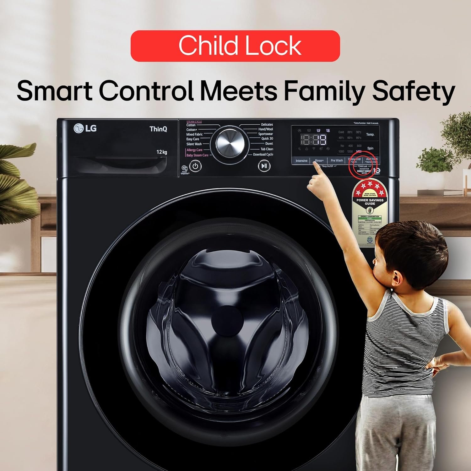 Energy Rating: 5 Star- Best in class efficiency | Inverter direct drive technology for energy savings, less vibration & less noise | Please refer to BEE label for more information